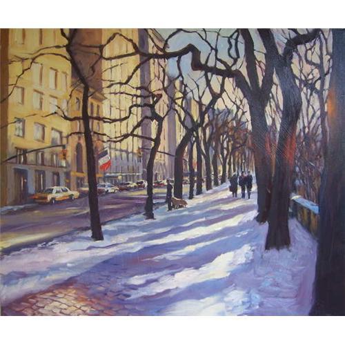 A scene on New York?s Fifth Avenue alongside Central Park by the exciting, new American Impressionist who is capturing the attention of critics and collectors all over the country. 20?x24? oil on canvas, signed by the artist. Unframed on stretchers. Domestic shipping and packing $125. International depends upon location.