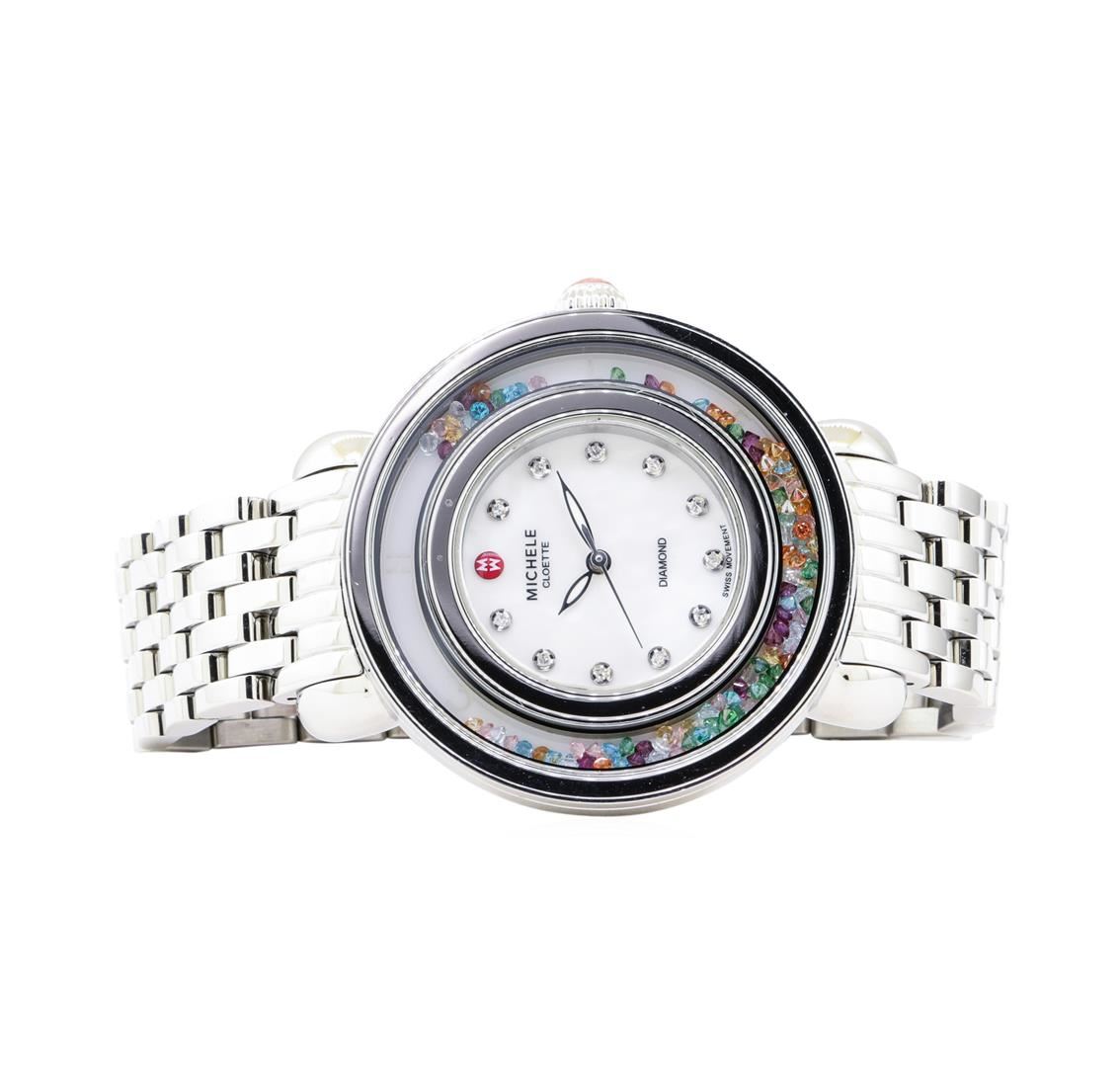 One lady's, hand crafted and machine milled Michele round case Cloette wrist watch electronically tested stainless steel, Serial#: HF00309SS, Case: 38mm, Crown: fluted pull-out, Bezel: floating gemstones, Crystal: synthetic sapphire, Movement: swiss movement, Dial: white mother of pearl with spade style with luminous fill and diamond marker numerals, Bracelet: matching, Condition: G-8 mint. The featured lady's wristwatch contains 0.03ctw of diamonds set in the face and 1.60ctw of floating multi-colored gemstones in the bezel.. Total Weight of Watch 104.00gm GAS Appraised at $2500.00. GAS Appraised.