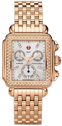 Model: MWW06P000109 - CASE = [Material:Polished Rose Gold Tone], [Case Diameter:33], [Case Thickness:10.7mm], [Bezel:Set with 120 Diamonds (0.66 Carets Total Weight)], [Case Back:Solid], [Water Resistant:50 Meters - 165 Feet], [Crystal:Scratch Resistant Sapphire], DIAL = [Color:White Mother Of Pearl Chronograph with Day and Date at 6], MOVEMENT = [Type:Battery Powered Quartz], BAND = [Clasp:Double Folding Push Button], [Type:Polished Rose Gold Tone], (Usually ships in 1 to 2 business days.)