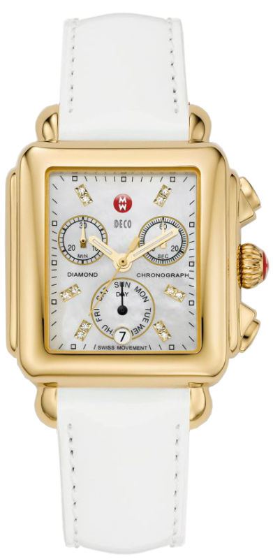 Model: MWW06P000032 - CASE = [Material:Polished Yellow Gold Tone], [Case Diameter:33], [Water Resistant:50 Meters - 165 Feet], [Crystal:Scratch Resistant Sapphire], DIAL = [Color:White Mother of Pearl Diamond], MOVEMENT = [Type:Battery Powered Quartz], BAND = [Clasp:Tang Buckle], [Type:White Patent Leather], (Usually ships in 1 to 2 weeks.)