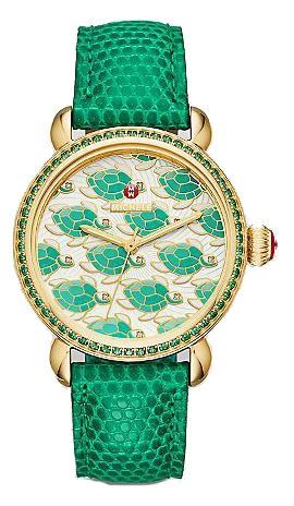 Model: MWW05E000002 - CASE = [Material:Gold Tone Stainless Steel], [Case Diameter:36], [Bezel:Fixed], [Water Resistant:50 Meters - 165 Feet], [Crystal:Scratch Resistant Sapphire],; DIAL = [Color:Green Textures Pattern],; MOVEMENT = [Type:Quartz], [Crown:Push In],; BAND = [Clasp:Tang], [Type:Green Leather], (Usually ships in 2 to 4 weeks.)