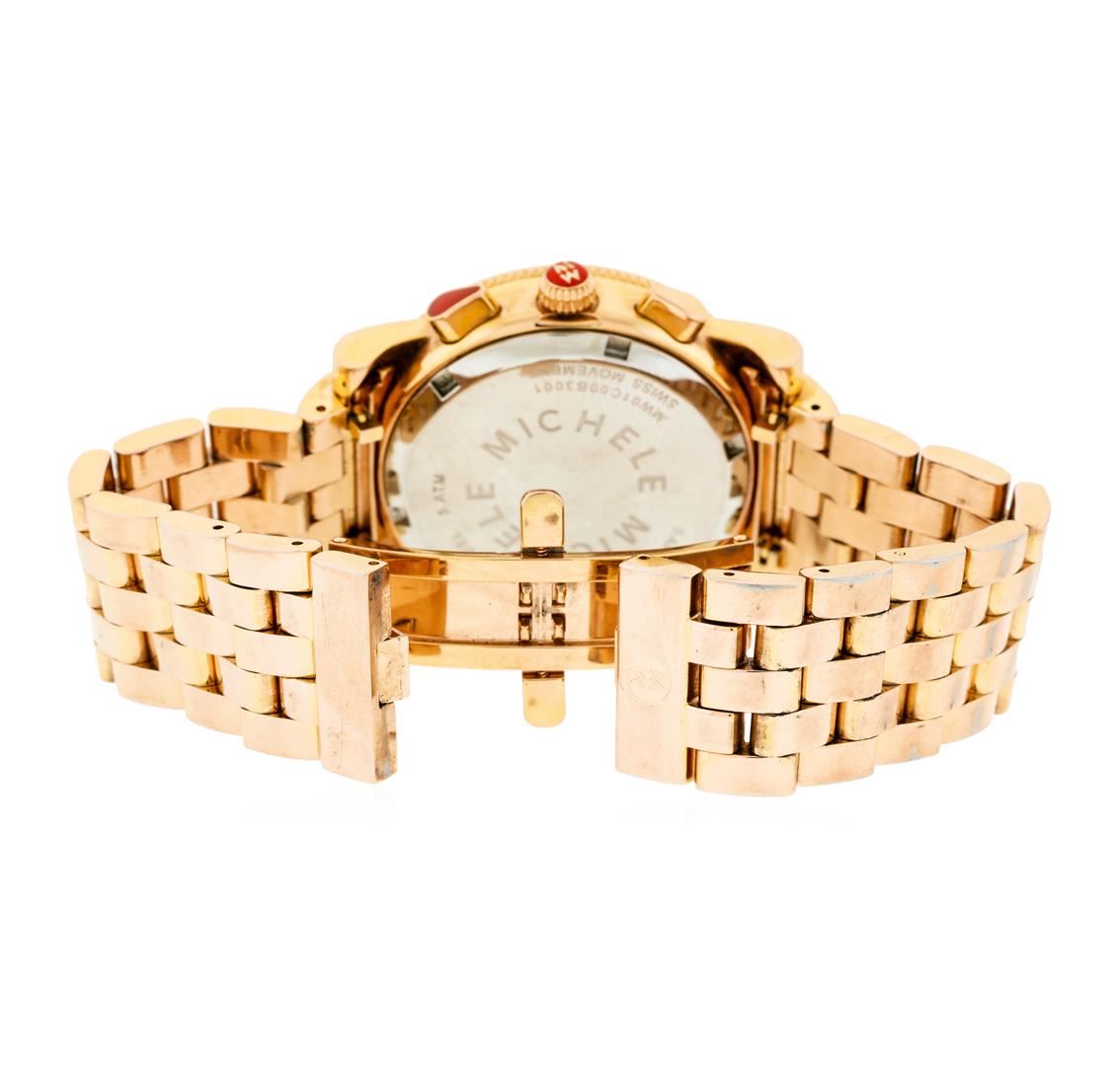 One Michele chronograph midsize watch featuring: Case: Gold plated. Bezel: Gold plated. Dial: White color; luminous hour and minute hands. Chronograph function. Date window located at the 6 o'clock position. Bracelet: Gold plated.