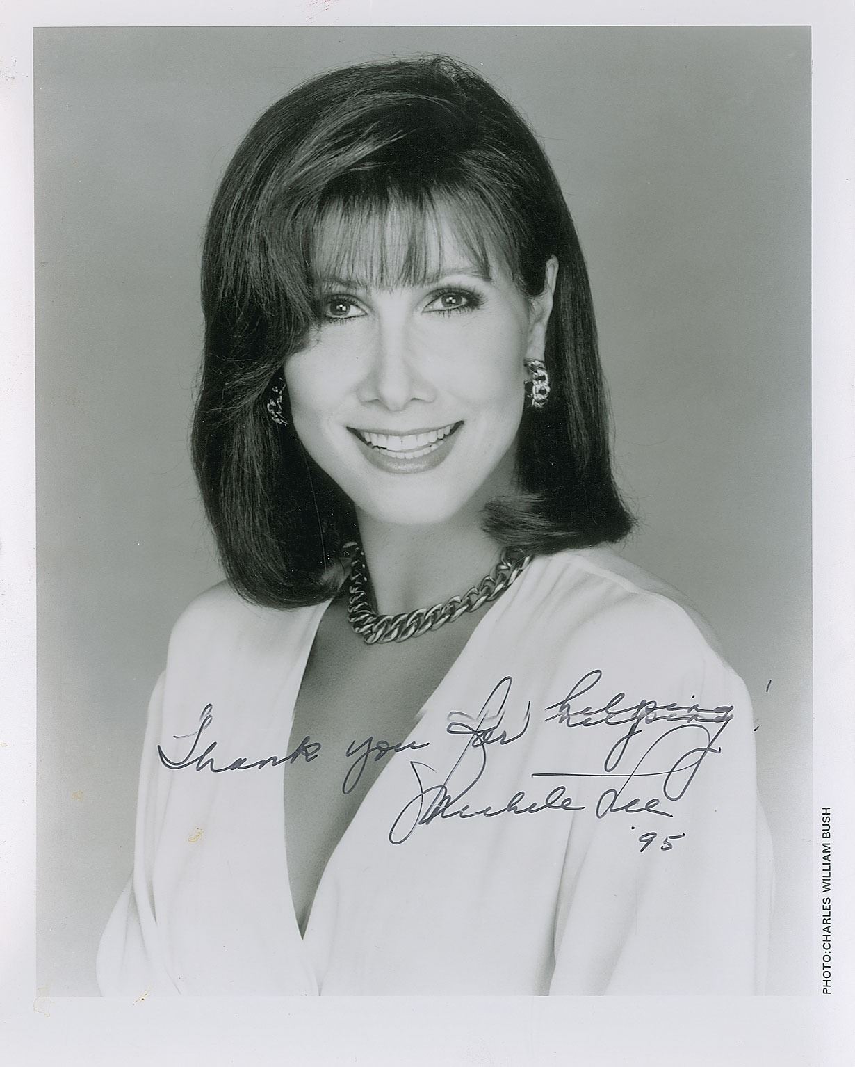 Brad-bound final draft script for the pilot episode of Knots Landing, 65 pages, 8.5 x 11, dated January 22, 1979, signed on the front cover in black ink, "Thank you for everything. This is our first episode ever! Michele Lee, 1995." Also includes a satin-finish 8 x 10 publicity photo, signed in black felt tip, "Thank you for helping! Michele Lee, '95." In overall fine condition.