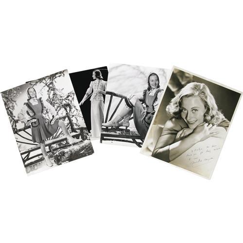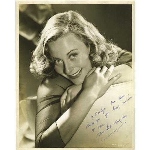 <B>Michele Morgan Autographed Photos and Three Publicity Shots.</B></I> A very alluring 11" x 14" portrait of Michele Morgan, circa 1941, signed "To Evelyn Van Horn - Thank you for being so nice to me Michele Morgan." The beautiful French actress with her Garbo-like quality came to Hollywood in 1941 after success in her native country. Her U.S work included star roles opposite Paul Henreid in <I>Joan of Paris</B></I> (1942), Frank Sinatra in <I>Higher and Higher</B></I> and Humphrey Bogart in <I>Passage to Marseilles,</B></I> but she would find her greatest success back in Europe - winning the Cannes Film Festival Award for playing the blind heroine of <I>Symphonie Pastorale, La</B></I> (1946) and maintaining her stardom to this day. The lot also includes three RKO publicity 11" x 14" shots of Ms. Morgan - one of her posing on profile with statuary of dogs, and two of the lady costumed for ice-skating. The autograph has a few very slight smudge/smear marks, notably on the "l" in "Michele" and the PR shot with the dog statues has a crease in the right corner above the actress's head - otherwise the four items are in Excellent condition. A lovely package and a charming tribute to a star of both Hollywood and European cinema. <I>With COA from PSA/DNA.</B></I>