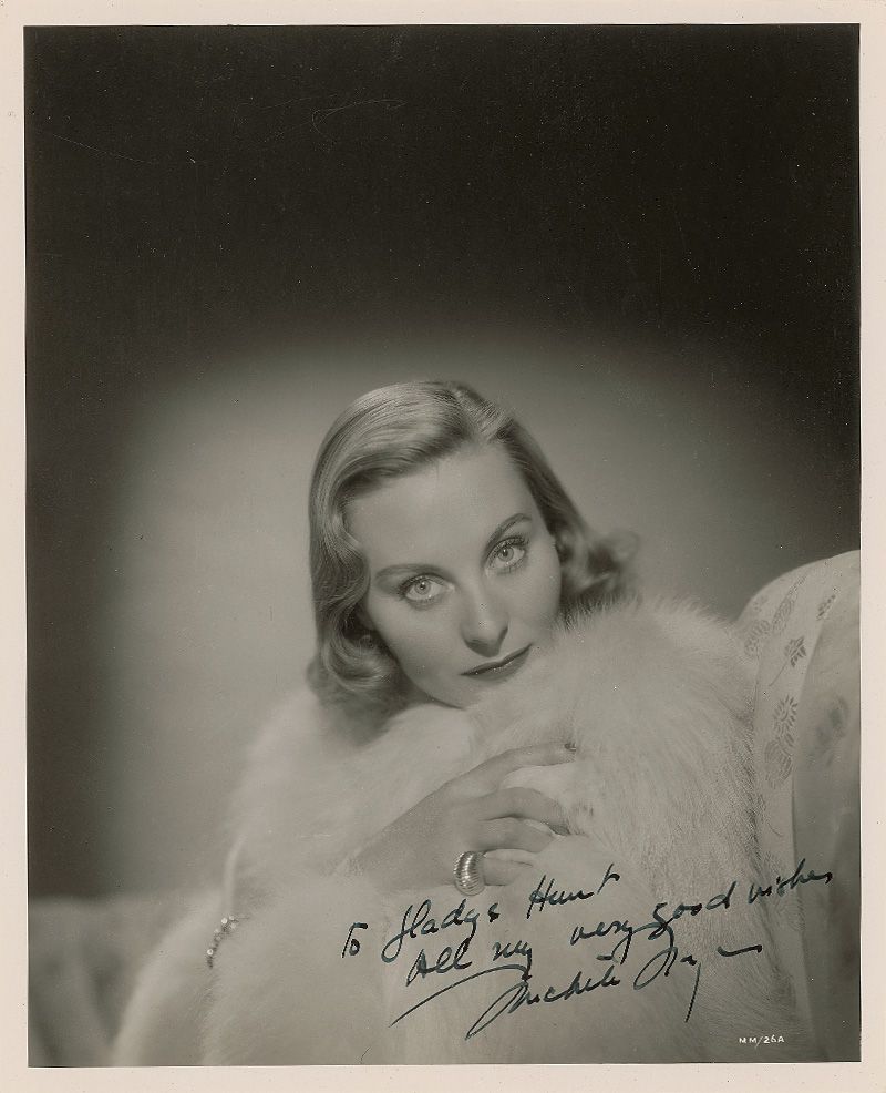Vintage glossy 8 x 10 photo of Morgan wrapped in a fur stole, signed and inscribed in fountain pen “To Gladys Hunt, All my very good wishes, Michele Morgan.” In fine condition, with some scattered light dings and surface marks.
