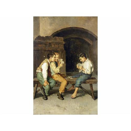 Italian [late 19th/early 20th century] THREE BOYS PLAYING CARDS oil on panel 13.5 x 9.25 in. (34.3 x 23.5 cm) signed; signed & titled indistinctly verso