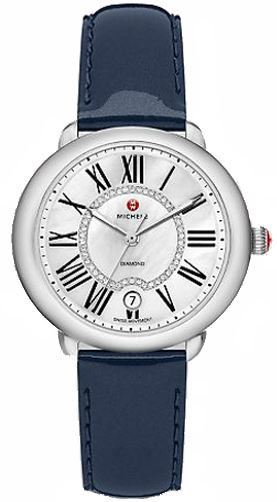 Model: MWW21B000012 - CASE = [Material:Stainless Steel], [Case Diameter:36], [Bezel:Fixed], [Case Back:Solid], [Water Resistant:50 Meters -165 Feet], [Crystal:Scratch Resistant Sapphire], DIAL = [Color:White Mother Of Pearl With Diamonds], MOVEMENT = [Type:Quartz], [Crown:Push Down], BAND = [Clasp:Tang], [Type:Blue Patent Leather], (Usually ships in 1 to 2 weeks.)