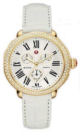 Model: MWW21A000013 - CASE = [Material:Stainless Steel with Gold Tone], [Case Diameter:40], [Bezel:Diamonds on Bezel], [Case Back:Solid], [Water Resistant:50 Meters/ 150 Feet], [Crystal:Scratch Resistant Sapphire], DIAL = [Color:Glossy White], MOVEMENT = [Type:Battery Powered Quartz], BAND = [Clasp:Tang], [Type:White Crocodile Leather], (In Stock - Ready to ship.)