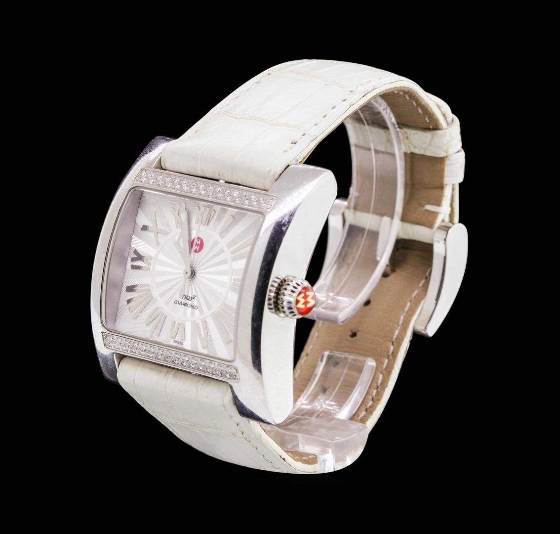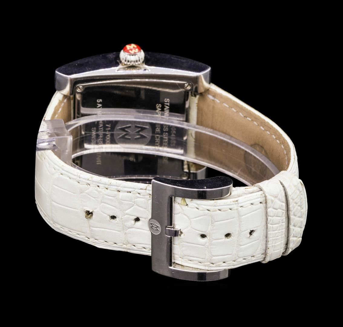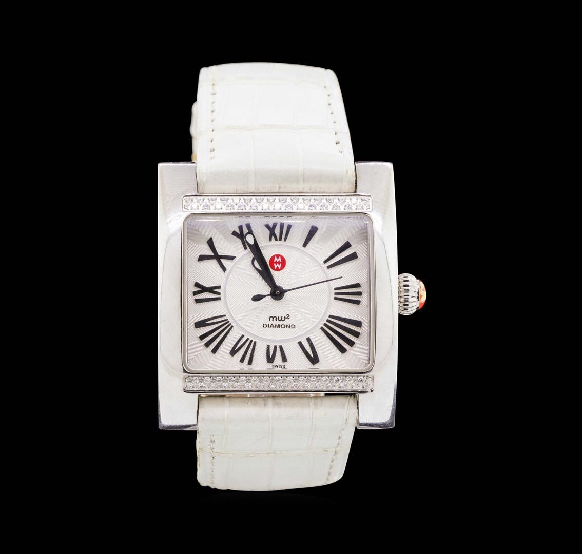 One stainless steel Michele MW2 Diamond wristwatch with an attached white alligator leather strap. The dial is white with Roman numeral hour markers and a silver luminous hand, the bezel is stainless steel set with diamonds. Crystal: scratch resistant sapphire. Movement: Quartz. Serial number P00549SS, model number 71-7000.