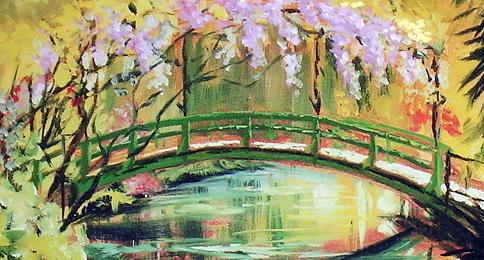 The beautiful and graceful Japanese bridge that crosses the lily pond on Claude Monets property at his home in Auvers-sur-Oise is captured in all its splendor by the emerging American Impressionist, Michelle Byrne, during her recent trip to France. 30x40 in. hand embellished giclee on canvas can be framed without glass like a painting. Domestic shipping $35. International depends upon location.