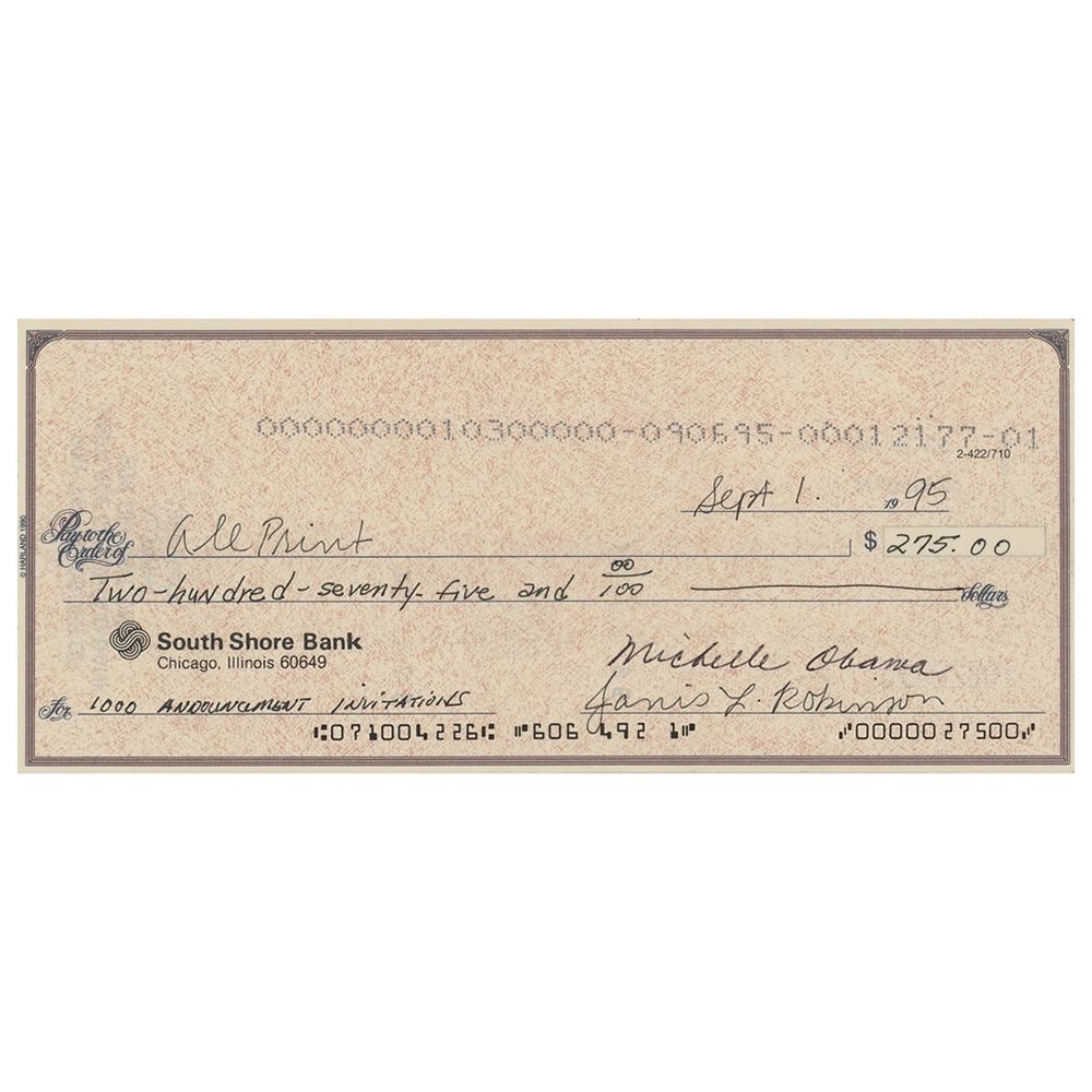 South Shore Bank check, 7.75 x 3.25, partially filled out and signed by Obama, "Michelle Obama," payable to All Print for $275, September 1, 1995. Obama fills out the amount and the memo, "1000 Announcement Invitations"; her sister-in-law, Janis L. Robinson, also signs, filling out the date and recipient. In very fine condition. These announcement invitations were most likely associated with Barack Obama's run for an Illinois state senate seat—he began fundraising in July 1995, created a campaign committee on August 7th, and filed its statement of organization on September 5th. On September 19, 1995, the 34-year-old Barack Obama announced his candidacy to a standing-room-only audience of 200 supporters at the Ramada Inn Lakeshore. He would go on to win the November 1996 election, taking 82% of the vote. Rare in this format, this is the first Michelle Obama check we have offered.