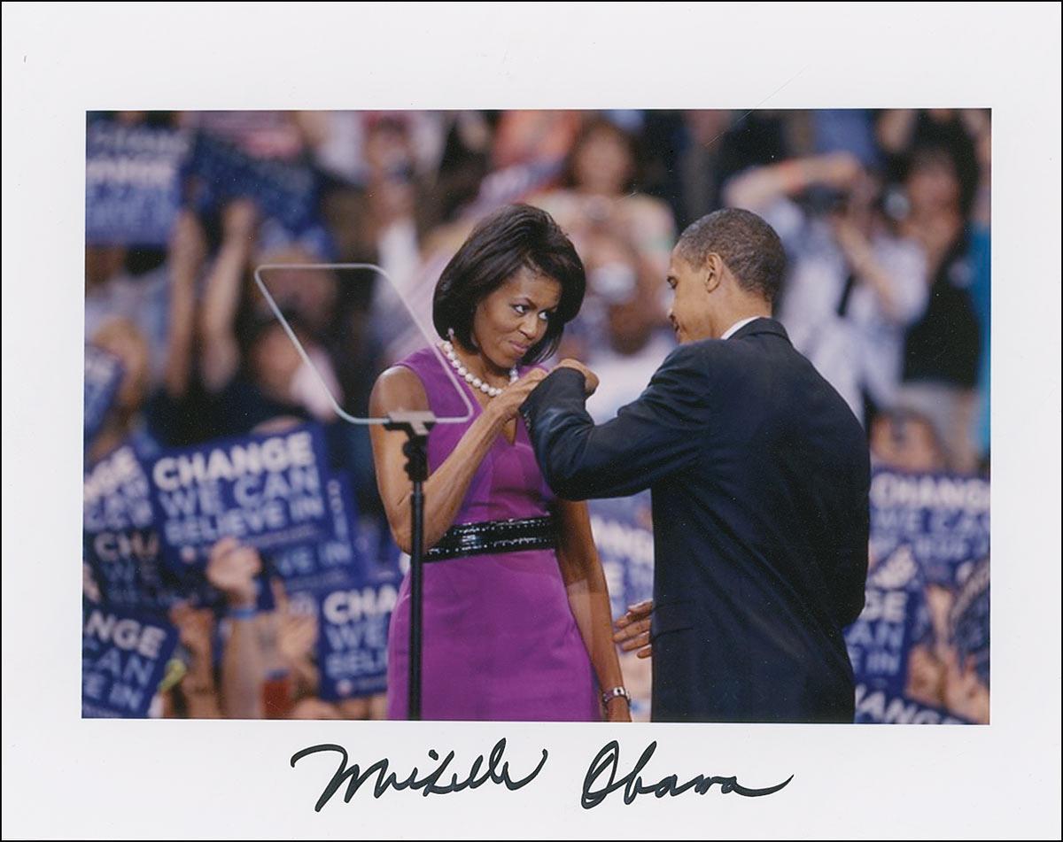 Color satin-finish 10 x 8 photo of Michelle Obama giving her husband a ‘fist bump’ before a 2008 speech in Minnesota, signed in the bottom border in black felt tip. In fine condition, with a few light bends and a tiny water spot.