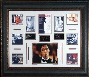 Scarface custom premium framed unautographed Signature Engraved oversize 27x39 piece. FEATURING THE ENGRAVED SIGNATURES OF Michelle Pfeiffer, Al Pacino, and Steven Bower. FRAMED AS SHOWN TO AN OVER-ALL SIZE OF 27"X39"