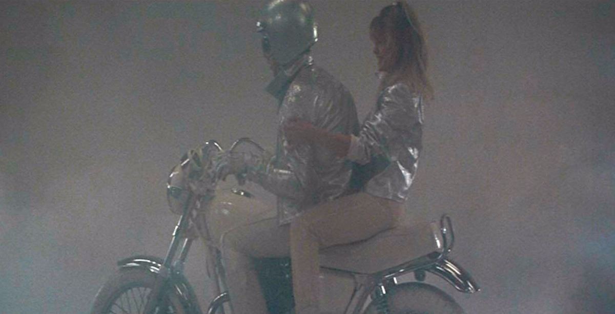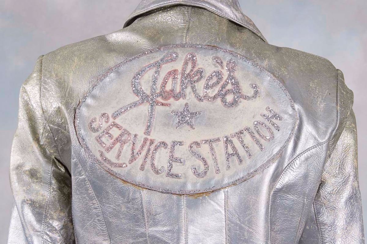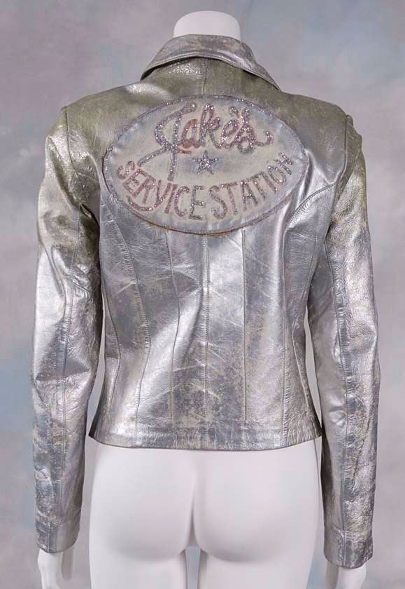 Michelle Pfeiffer’s screen-worn jacket from her role as Stephanie Zinone in the 1982 film Grease 2. The attractive silver motorcycle jacket has a front zip closure and a large, glittery patch on the back reading, “Jake’s Service Station,” with a star in the center. In fine condition. The actress is seen wearing this jacket while riding on the back of a motorcycle driven by her love interest, Michael Carrington.