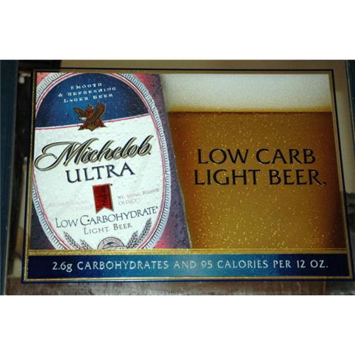 Fabulous Michelob Ultra Low Carb Light Beer Bar Mirror. This mirror shows some special details. The amber glass of beer shows bubble details. The bottle label show condensation droplets. The wood frame is 20 1/2" x 26 1/2". <p>The painted wood frame has chipped paint here and there. The mirro is in excellent condition. <p> There is some reflection from my ceilng fan that show in the 3rd pictures