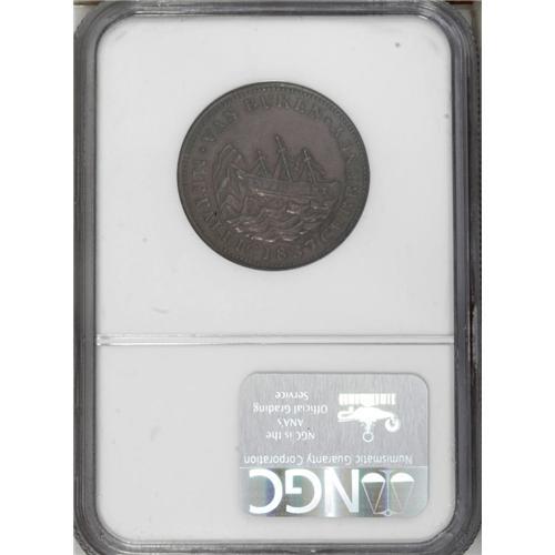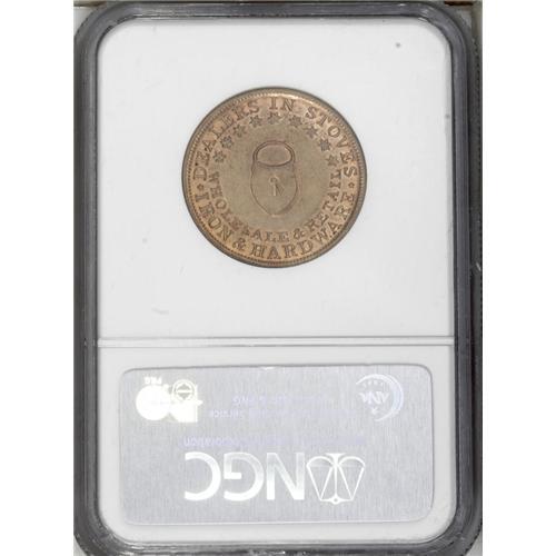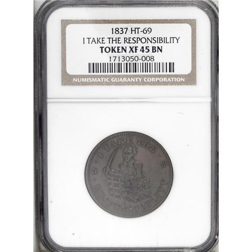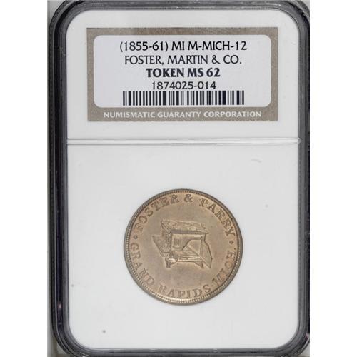<B>Michigan (1855-61) MI M-MICH-10 (not 12 as labeled), Foster, Martin & Co., Grand Rapids, MS62 NGC,</B></I> bright, attractive surfaces; and a <B>1837 I Take The Responsibility, Low 44, HT-69, R.1, XF45 NGC,</B></I> deep brown patina.<BR><I>From The Troy Wiseman Collection.</B></I>