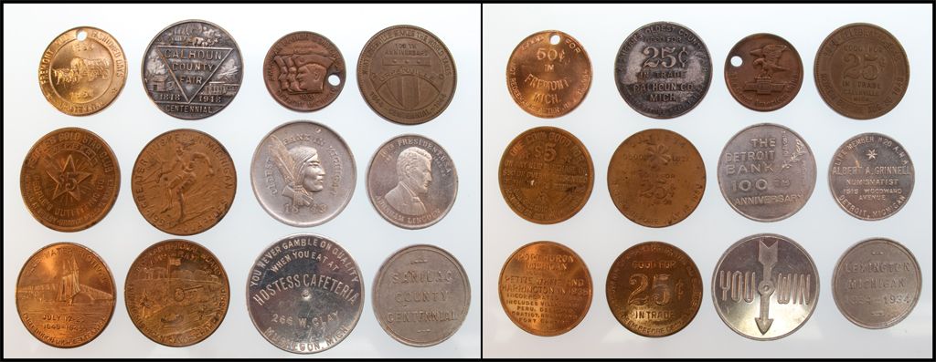 1.) SANILAC COUNTY CENTENNIAL // LEXINGTON, MI 1934 (aluminium) 2.) MICHIGAN NATIONAL GUARD CANOE CHAMPIONSHIP 1949 // CAMP GRAYLING GF 25c *rare 3.) CALHOUN COUNTY FAIR CENTENNIAL 1948 GF 25c IT 4.) GREENVILLE 100th Anv. GF 25c IT 1948 5.) PEOPLES OUTFITTING CO. GF $5 Detroit, MI (AU) 6.) AMERICAN LEGION DETROIT, MI 1931 // CHEVY (copper holed) 7.) BLUE WATER FESTIVAL CENTENNIAL PORT HURON, MI 1949 8.) GREATER MUSKEGON MICHIGAN AQUAPADES 1950 GF 25c (fun token) 9.) FREMONT OLD FASHIONED DAYS CENTENNIAL 1954 GF 50c 10.) HOSTESS CAFETERIA MUSKEGON, MI // YOU WIN (aluminium) 11.) THE DETROIT BANK 100TH Anv. 1949 // OLDEST BANK IN MICHIGAN / Indian Head Relief (AU aluminium) 12.) NUMISMATIST ALBERT A. GRINNELL / LIFE MEMBER #20 A.N.A. (aluminium) UNC