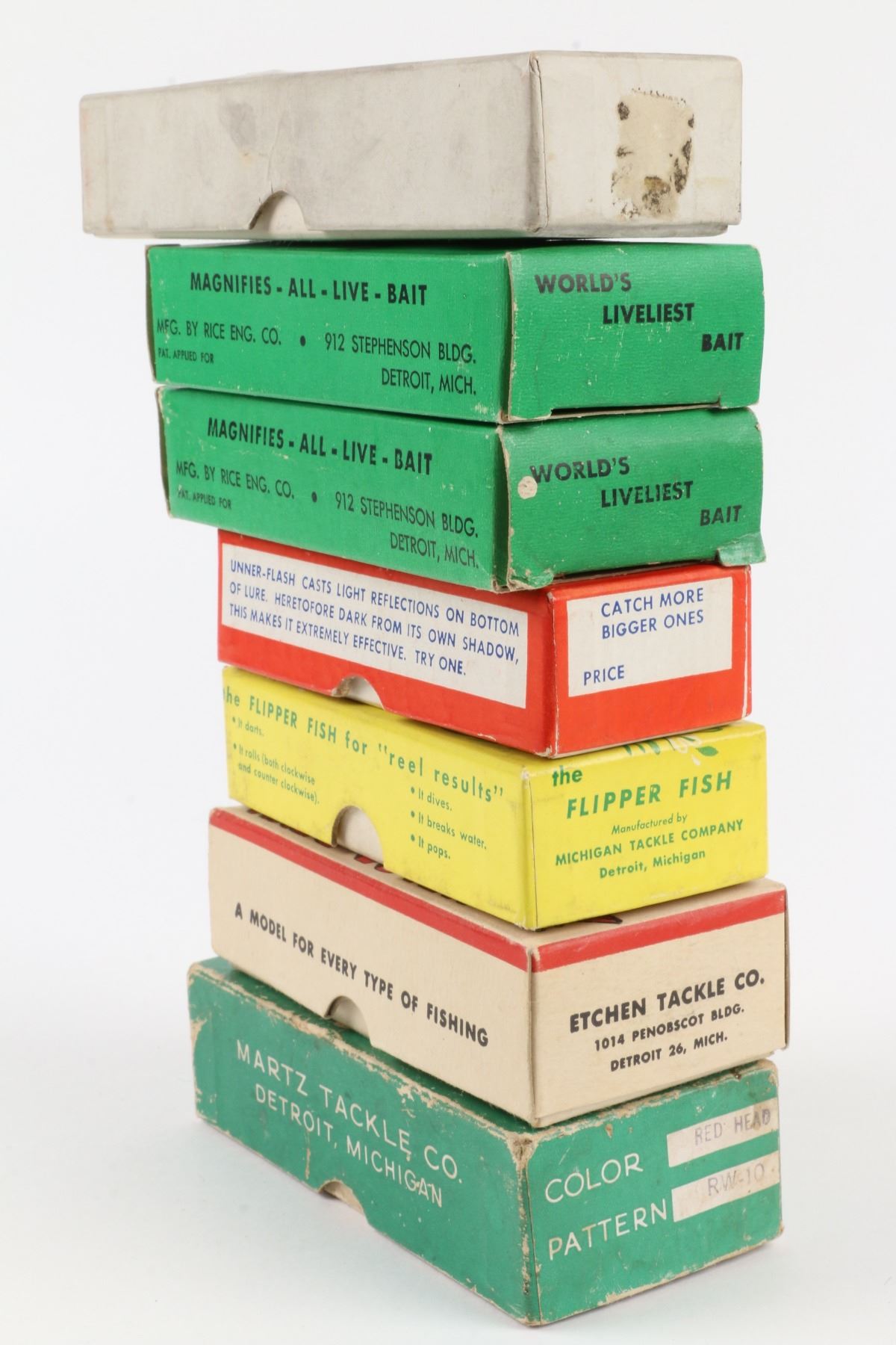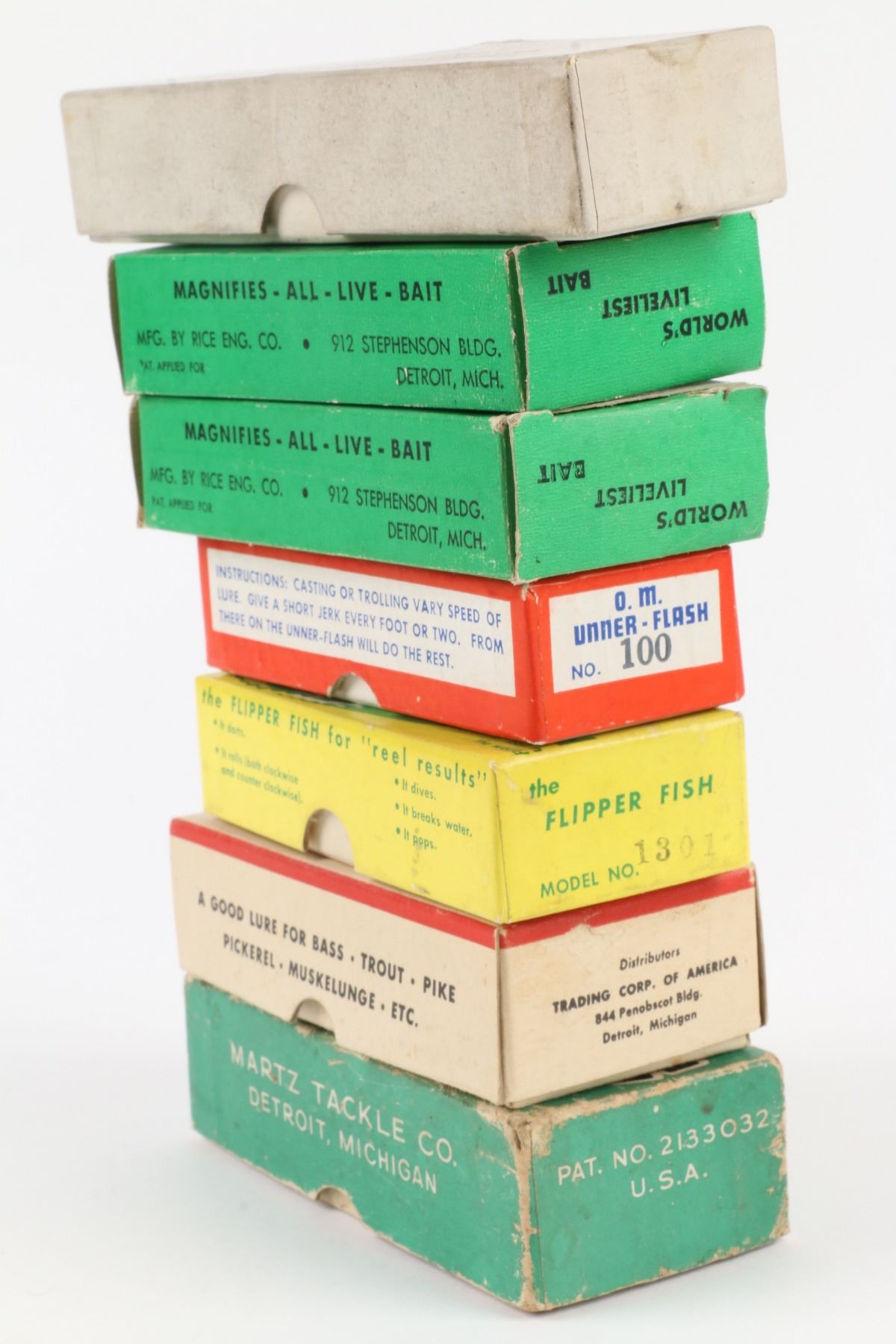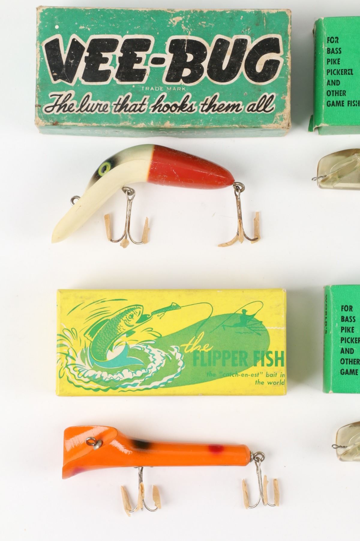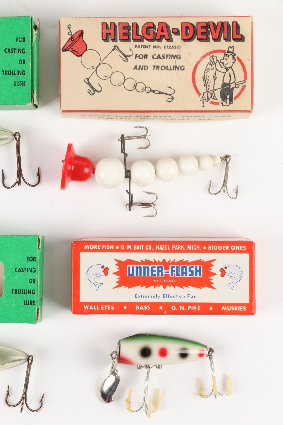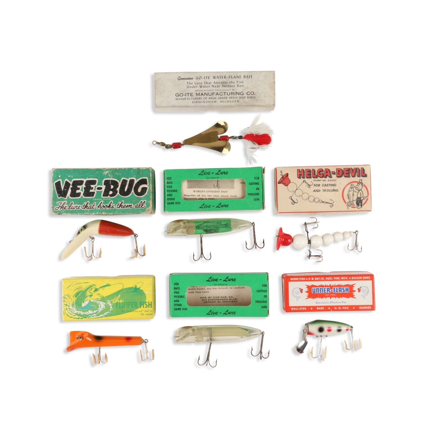 Vee-Bug, Live-Lure, Flipper Fish, Go-Ite, Helga-Devil, Unner-Flash, United States. Boxed. Material: Mixed. Quantity: 7. Grade: VG+. 4" - 5.75" boxes. Est. $100-125.