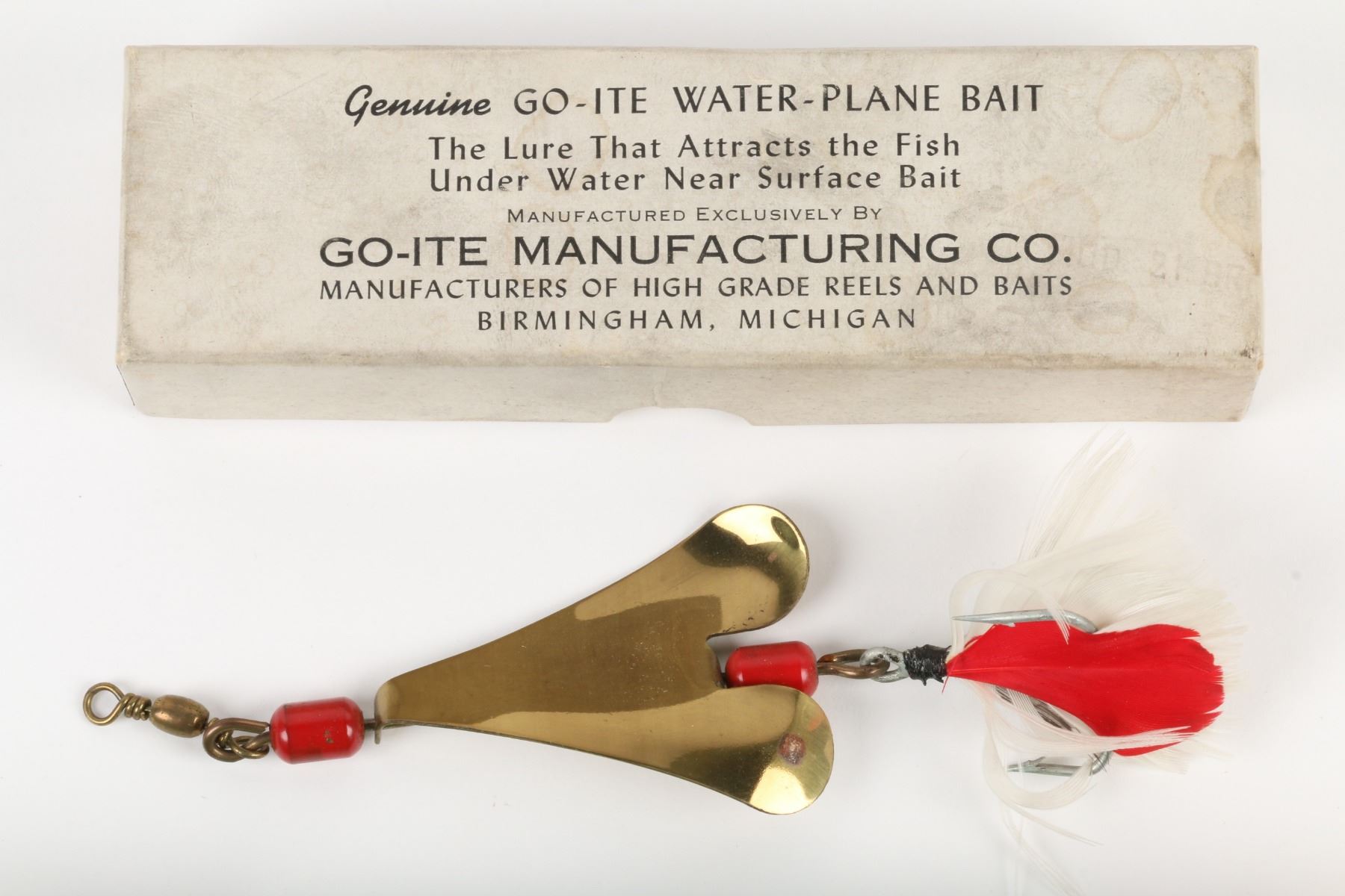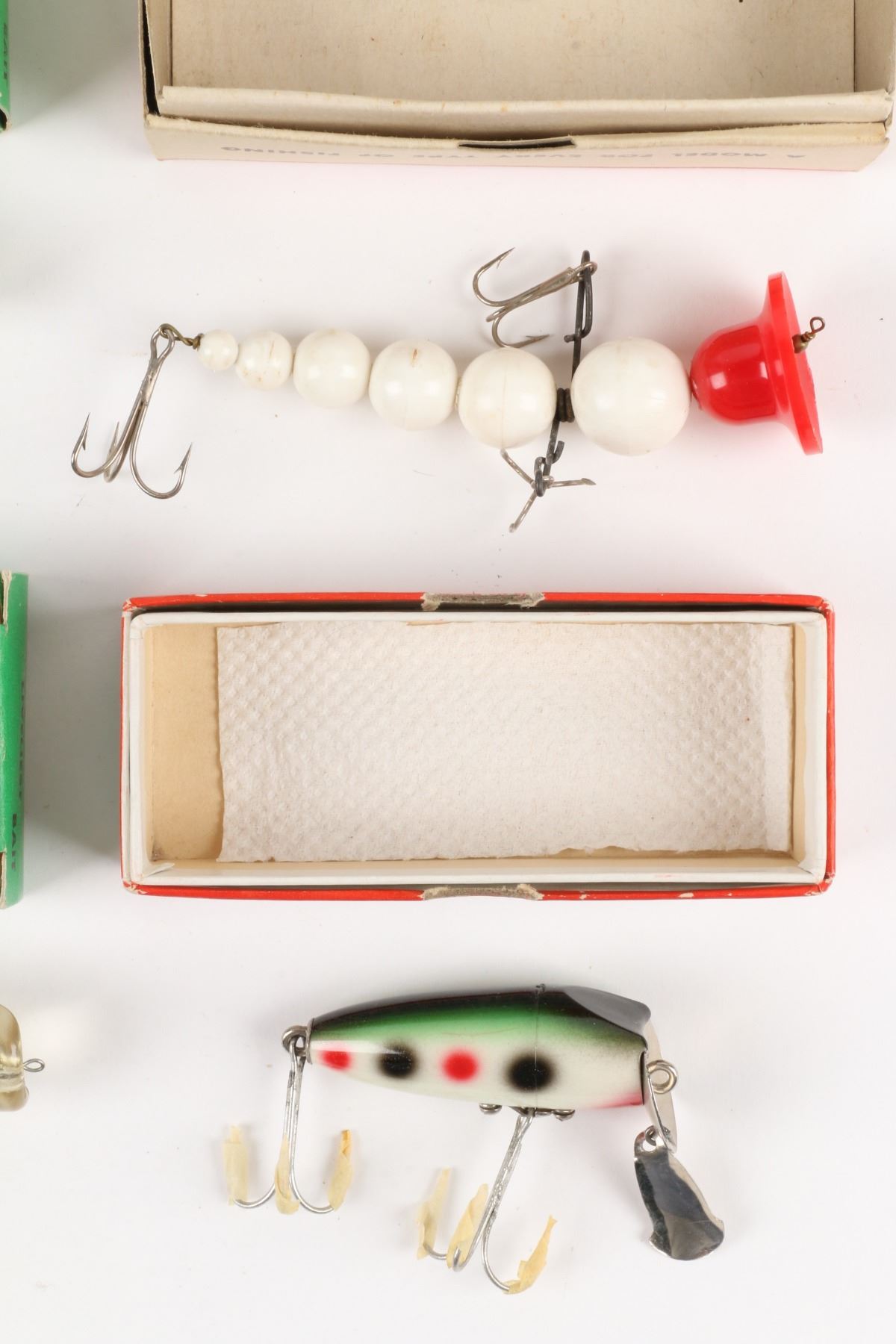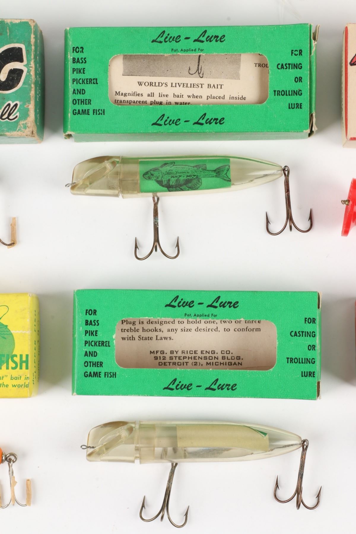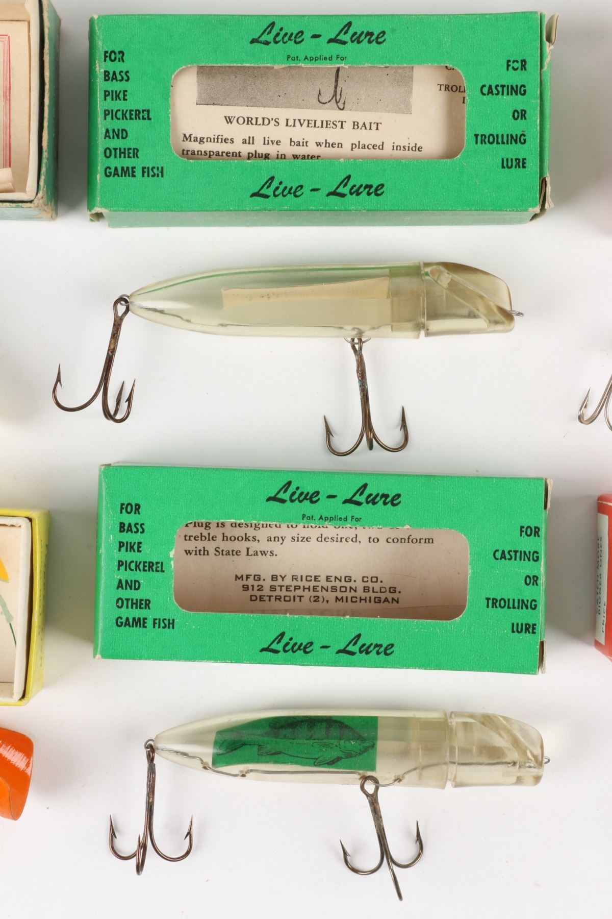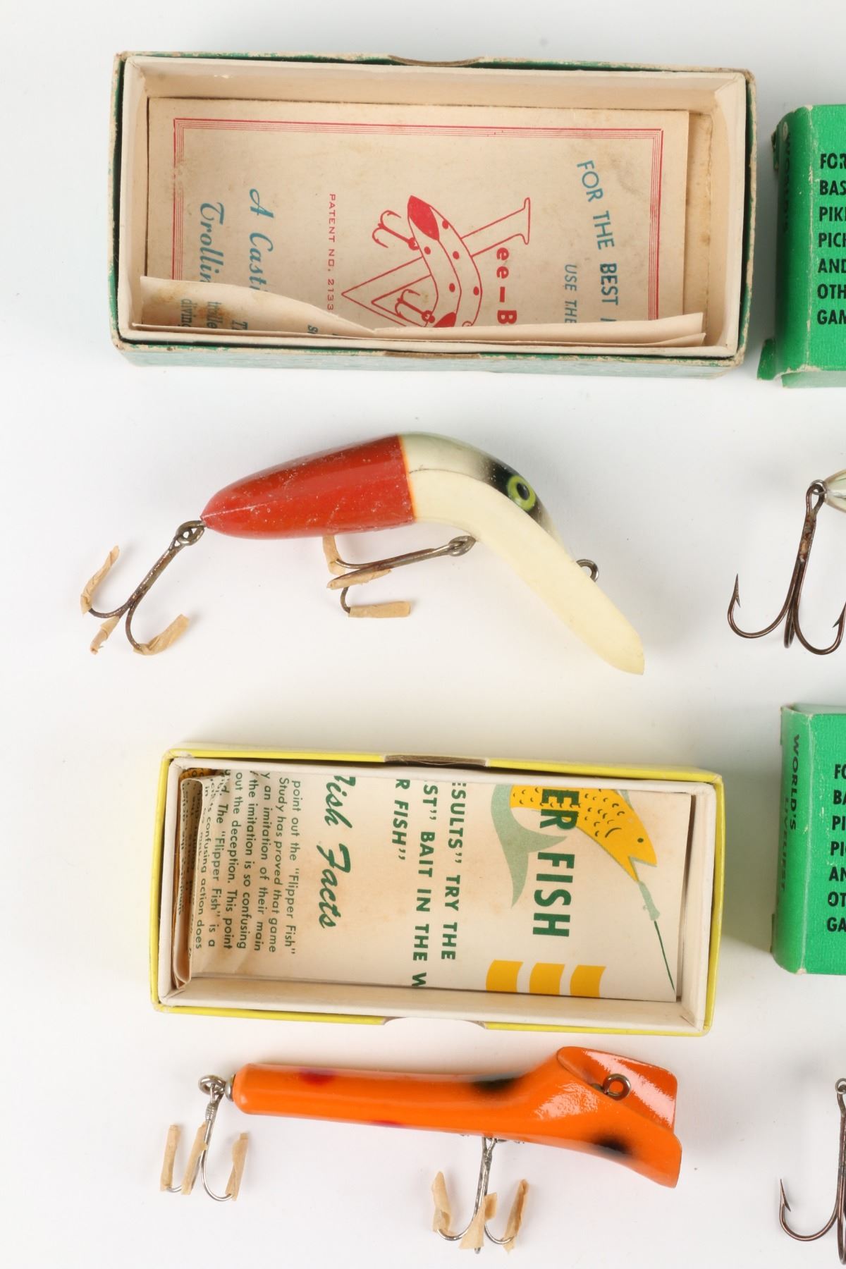 Vee-Bug, Live-Lure, Flipper Fish, Go-Ite, Helga-Devil, Unner-Flash, United States. Boxed. Material: Mixed. Quantity: 7. Grade: VG+. 4" - 5.75" boxes. Est. $100-125.