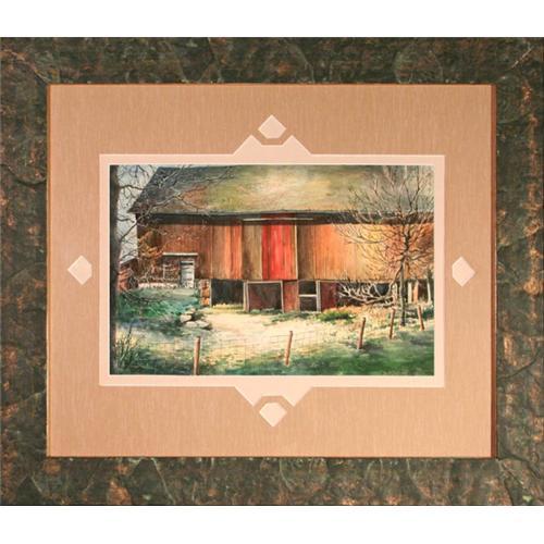 This superb watercolor by this talented artist MacIsaac is massive not only in size, but also in quality. The viewer is presented with a landscape setting that includes a large barn, which dominates most of the picture plane, a fence, trees and grass. Therefore, this piece is ruled by textures, both man made and natural. ...