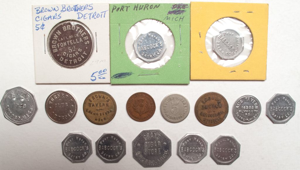 Sixteen tokens includes two Brown's Tavern in Laingsburg, Brown Brothers Cigars in Detroit, six Port Huron Babcock Dairy, Al's Tavern in Detroit, Turner's Club in DetroitCity: County: State: MIDate: