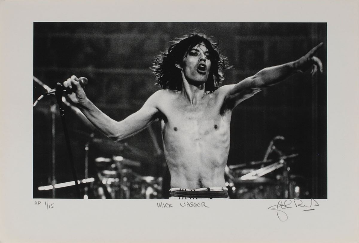 Limited edition 19 x 13 artist’s proof print showing Jagger during an intense shirtless performance, numbered AP 1/15, signed in pencil by photographer John Rowlands. In fine condition.