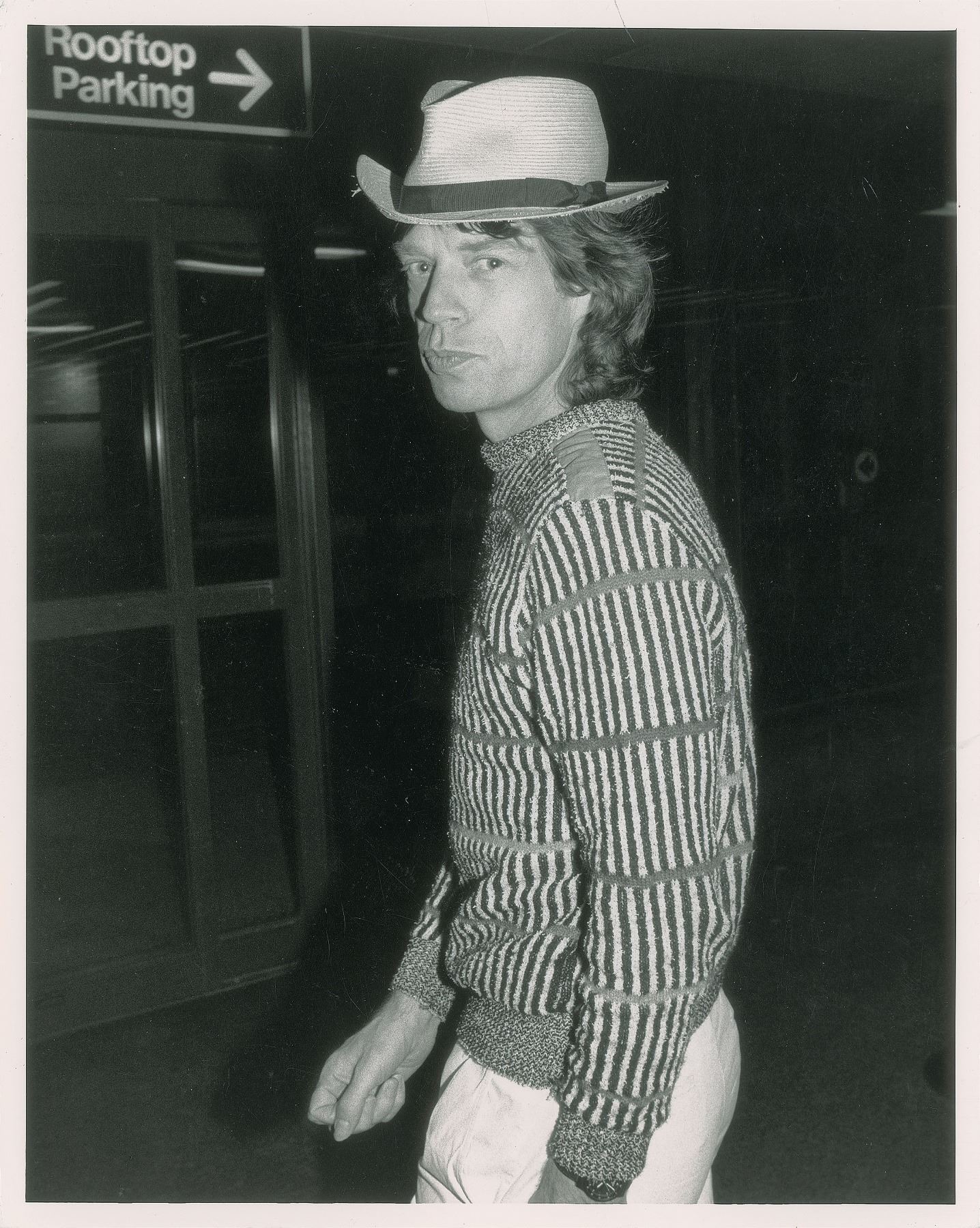 Sharp original glossy 8 x 10 silver gelatin photo of Mick Jagger arriving at New York's Kennedy Airport in November 1987, printed from the original negative. Reverse bears a London Features International copyright stamp and affixed caption. In fine condition.