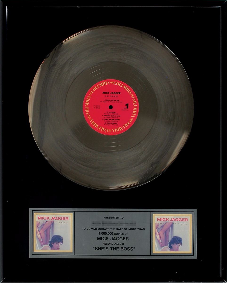 In-house platinum sales award presented “to commemorate the sale of more than 1,000,000 copies of Mick Jagger record album ‘She’s the Boss.’” Framed with its disc and plate bearing two small images of the album cover to an overall size of 16.25 x 20.25. Award retains its original backing. In fine condition.