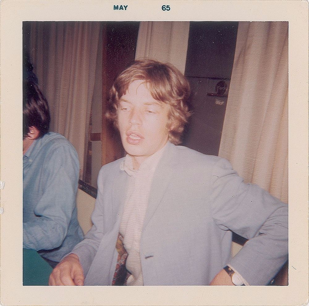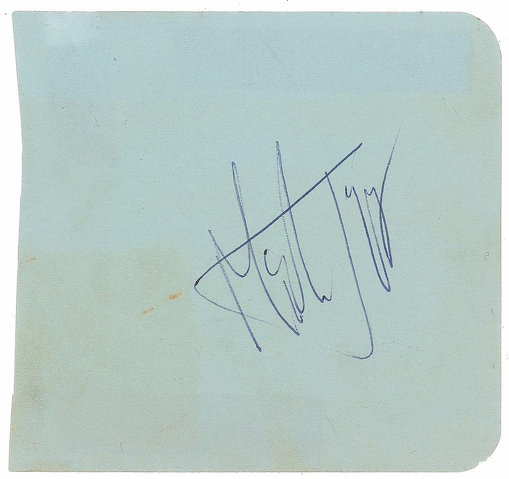 Vintage ballpoint signature, "Mick Jagger,” on a light blue 4.25 x 4 album page. Includes a color 3.5 x 3.5 candid photo of Jagger taken at the time of signing on May 9, 1965, before the Rolling Stones concert at Chicago’s Arie Crown Theatre, with reverse bearing a collector's date notation. In fine condition, with old mounting remnants on the reverse.