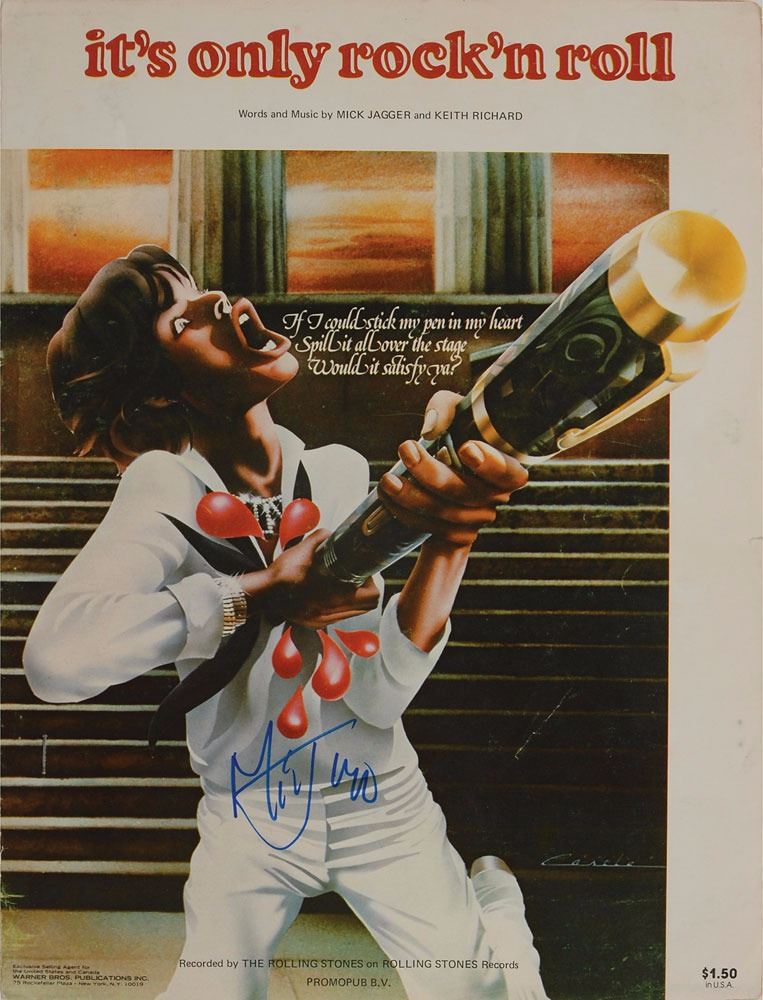 Sheet music booklet for 'It's Only Rock 'n Roll,' six pages, 9 x 12, signed on the front cover in blue felt tip by Mick Jagger. In fine condition, with scattered creasing and stains. Pre-certified REAL.
