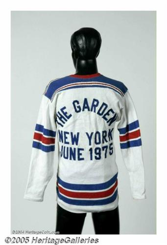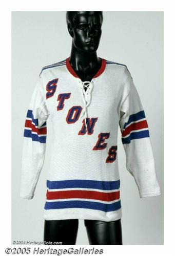 <B>Mick Jagger Stage Worn Concert Jersey.</B></I> An exceptional piece of stage wear worn by the inimitable Rolling Stones frontman during the Stones' 1975 Tour of the Americas. For the custom design, emulating the New York Rangers hockey jersey, Jagger commissioned well-known New York jersey designer Gerry Cosby of Madison Square Garden to create this unique article of clothing. Throughout the tour, Jagger would appear onstage during a show in a Stones jersey made in the likeness of that arena's home hockey team. Jagger wore this particular jersey throughout the Stones' four-night concert appearance at Madison Square Garden, June 22-25, 1975. The front features custom-stitched lettering that reads "Stones," while the back reads: "The Garden, New York, June 1975." Embroidered on the inside lining of the neck is an official wardrobe tag from Gerry Crosby Athletic Outfitters & Co. Acquired directly from Jagger's wardrobe.