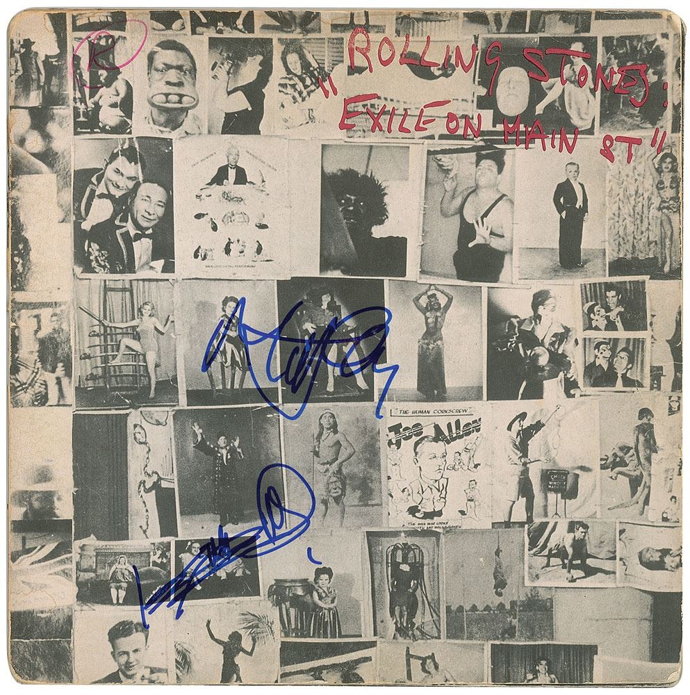 Exile on Main St. album by the Rolling Stones, signed on the front cover in blue felt tip by Mick Jagger and Keith Richards. In very good to fine condition, with light scuffing, corner wear, and an ownership initial to the upper left corner. The record is included. Accompanied by a John Brennan Collection letter of provenance.