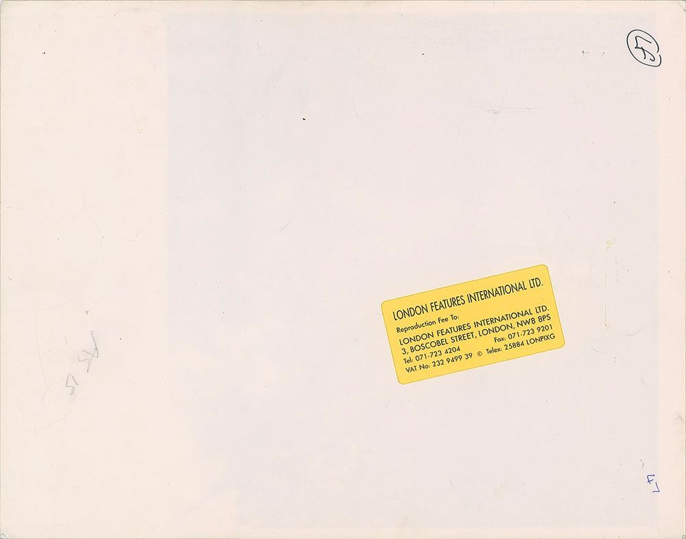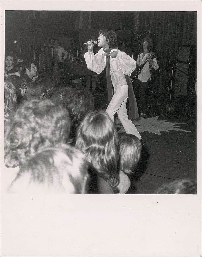 Original matte-finish 9.25 x 12 silver gelatin full-length photo of the Rolling Stones during a performance, showing Mick Jagger singing to the crowd and Mick Taylor playing the guitar in the background. Reverse bears a London Features International label. In fine condition, with a few surface marks and creasing to corners, the latter easily matted out. From the Globe Photo archives.