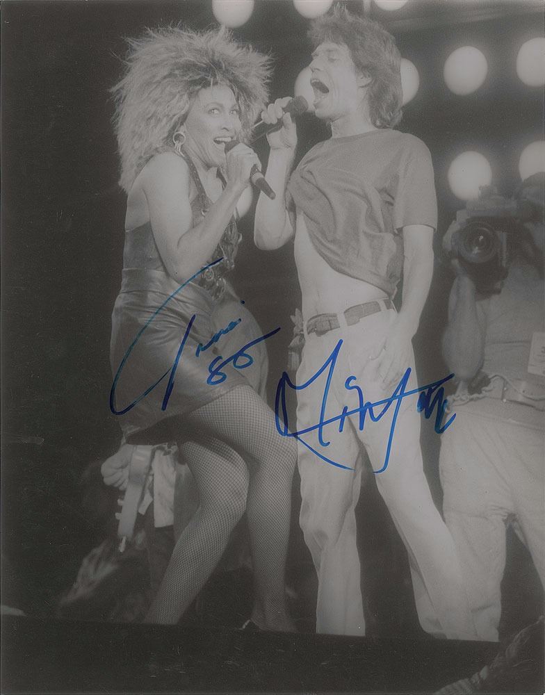 Glossy 11 x 14 photo of Tina Turner and Mick Jagger during their Live Aid performance in Philadelphia on July 13, 1985, signed in blue felt tip, "Tina, 85" and "Mick Jagger." In fine condition. Originally obtained by in-person specialist Mike Wehrmann.