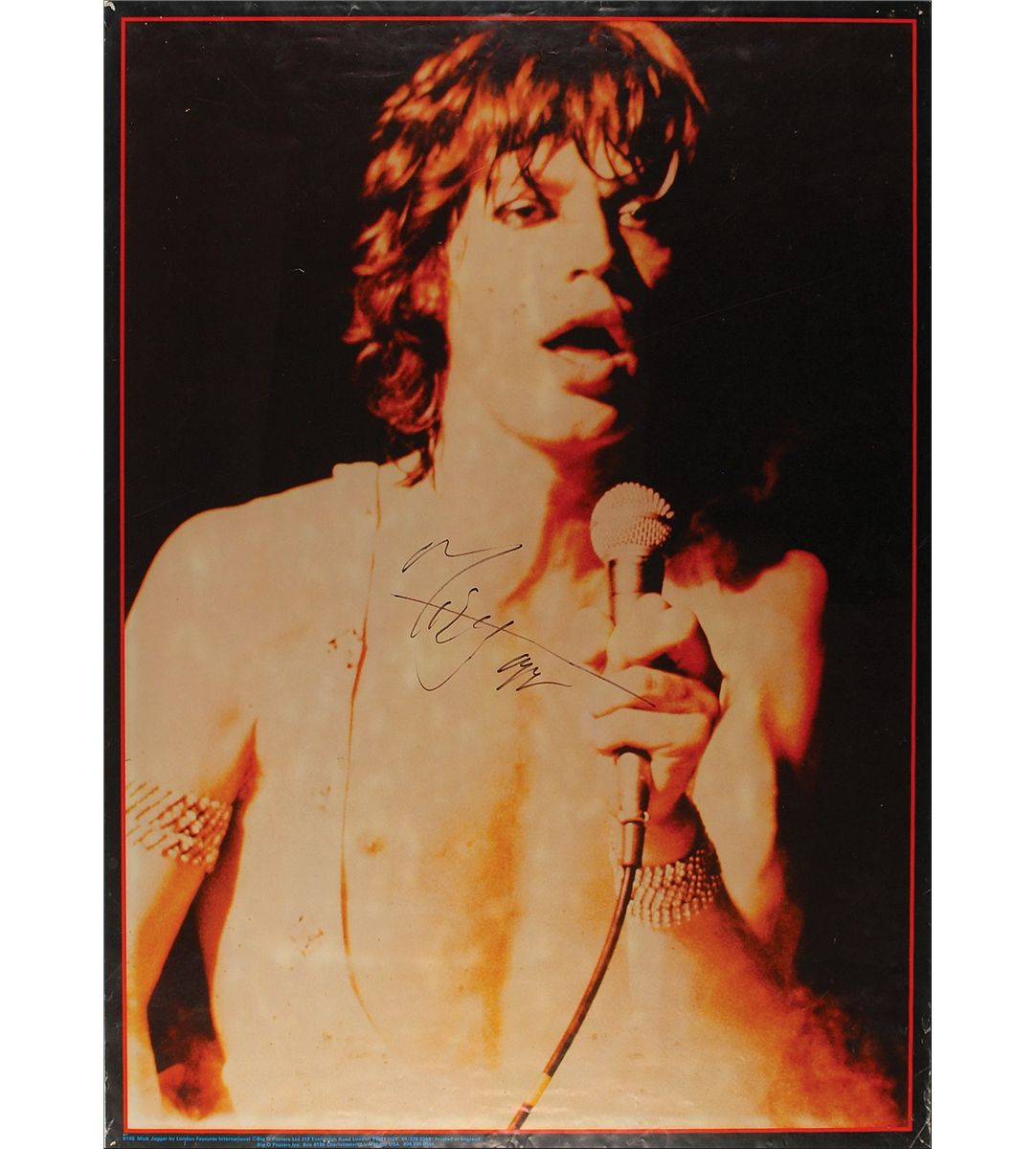 Color 24 x 33.25 poster of a shirtless Jagger on stage, signed in black felt tip. Scattered creases, a bit heavier to edges, and mounting remnants to reverse, otherwise fine condition.