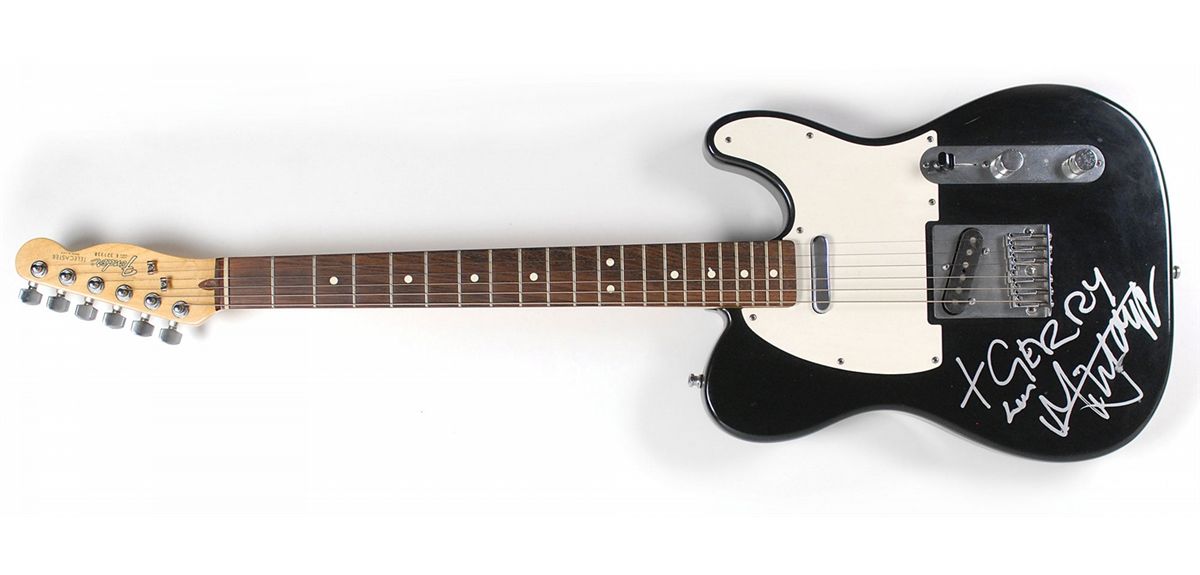Uncommon black-bodied Fender Telecaster electric guitar, serial number E321338, signed and inscribed on the body to noted entertainment and music agent Gerry Harrington, “Gerry, Love, Mick Jagger.” In fine condition, with a trivial brush to a single stroke of signature. Instruments signed by Jagger are quite rare, even more so are those presented to industry powerhouses like Harrington. Provenance: Gerry Harrington.