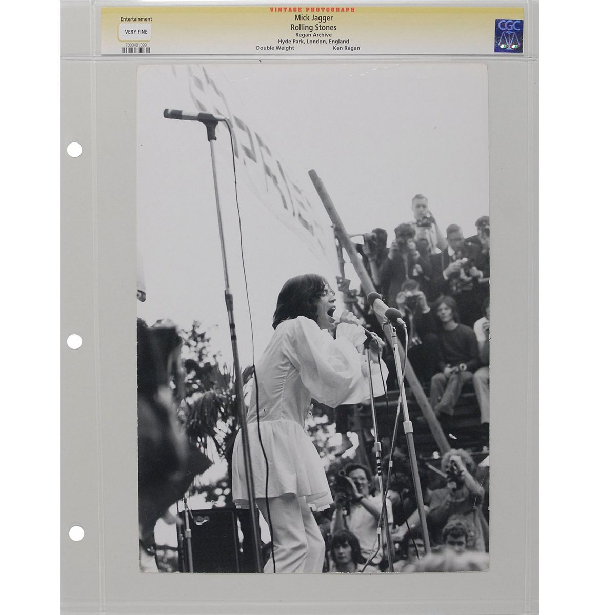 Vintage unsigned 9 x 13.25 doubleweight photo of Jagger on stage at Hyde Park in London taken by Phil Regan, and bearing his photographer’s credit stamp and notations on the reverse. Photo has been encapsulated by CGC and graded very fine. In fine condition, with scattered light edge creases.