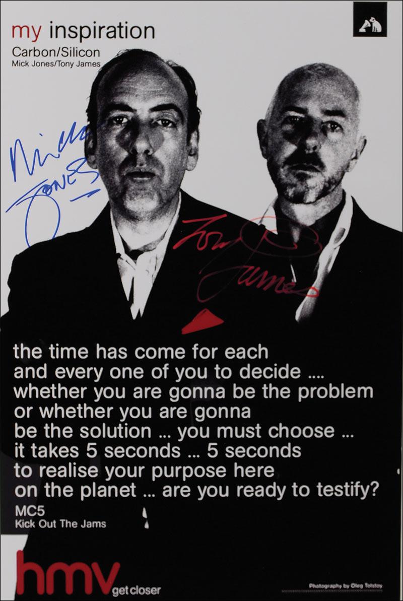 Color glossy 12 x 18 photo of a Carbon/Silicon poster, featuring printed lyrics to the MC5 song, ‘Kick Out the Jams,’ signed in blue felt tip by Mick Jones and in red paint marker by Tony James. In very fine condition.
