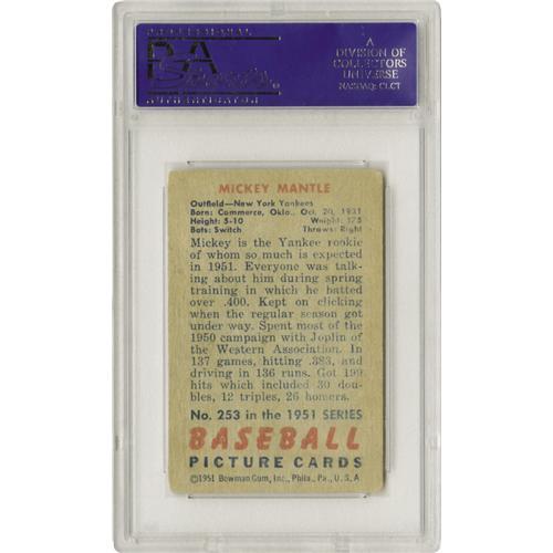 <B>Mickey Charles Mantle Signed 1951 Bowman #253, Autograph Grade PSA Mint 9.</B></I> What better home for a strong black "full name" autograph from this Yankee legend than his true rookie card? One wise early 1990's collector took this imperfect (G-VG) but still highly presentable gum card to the Mick and requested something a little extra, garnering a complete "Mickey Charles Mantle" autograph that fills the lower half of this highly collectible cardboard. Slabbed by PSA/DNA for protection, unquestioned authenticity, and an autograph grade that should bring collectors running. <BR><BR><B>Important notice:</B> Heritage usually auctions material at the rate of 200-250 lots per hour. On some occasions eBay Live bid software or the Internet may not be able to keep up with the pace of the auction. We recommend placing a realistic absentee bid now as insurance to avoid disappointment. Occasionally the auctioneer may eliminate or reject an eBay Live bid, and the auctioneer may also reopen a lot after the close of the eBay live bidding (usually because we missed an audience bid), and may reject your bid even if it shows you as the winning bidder. By bidding via eBay Live, you agree that Heritage may award the lot to another bidder at its sole discretion under the circumstances described above or any other reasonable circumstances. Since eBay bids are not shown to us until we open the lot on the floor, we treat those bids just like floor bids. In most cases the floor responds before the eBay bid is presented to us, due to Internet lag time, so for consistency we have made it a policy that floor bids are always considered first over tie eBay live bids. Also please note that all Heritage lots purchased through eBay Live carry a 22.5% Buyer's Premium. Please make sure you read the Terms and Conditions before you bid. This lot is being auctioned in conjunction with a live floor auction by Heritage Galleries & Auctioneers. All final auction and invoice information will be supplied by Heritage Galleries & Auctioneers, and all other information should be considered preliminary. Lot:19090 <BR><BR><B>Winning Notification and Billing:</B> After the FINAL session in this auction is complete, Heritage will send e-mail and snail mail invoices. This process normally takes several days. All final auction and invoice information will be supplied by Heritage Galleries & Auctioneers, and all other information should be considered preliminary. <BR><BR>This auction will be conducted on a live auction floor and over the Internet through eBay Live. If you choose to place an absentee bid, please take a moment to <font color='#0000ff'><u><a href='http://pages.ebay.com/liveauctions/help/before/laabsentee.html'>learn how eBay Live absentee bidding works</a></u></font><font color='#000000'>