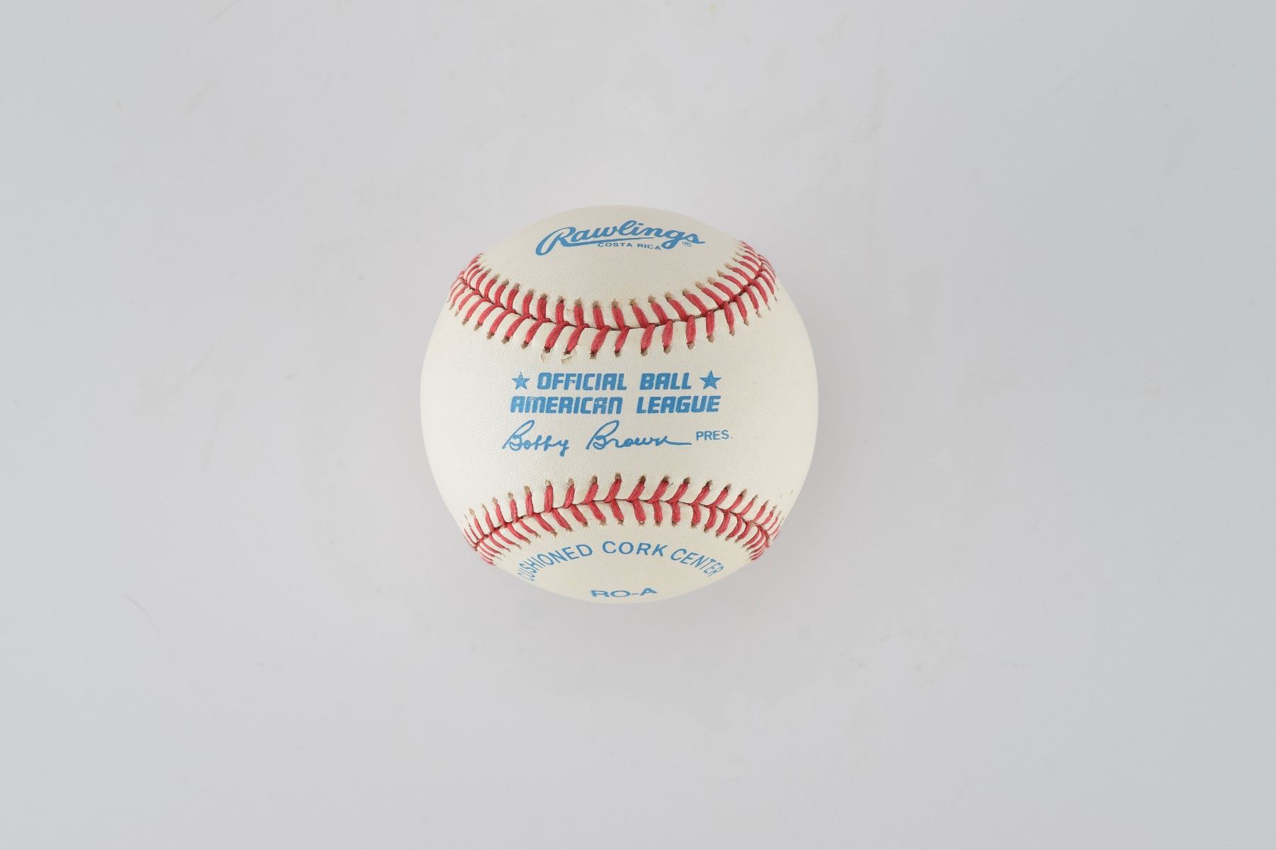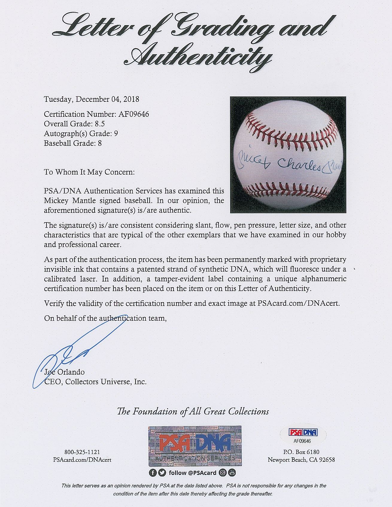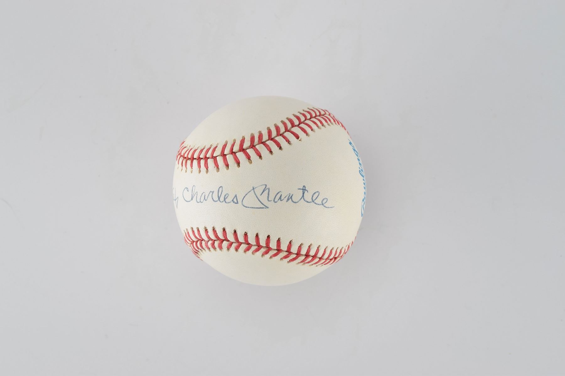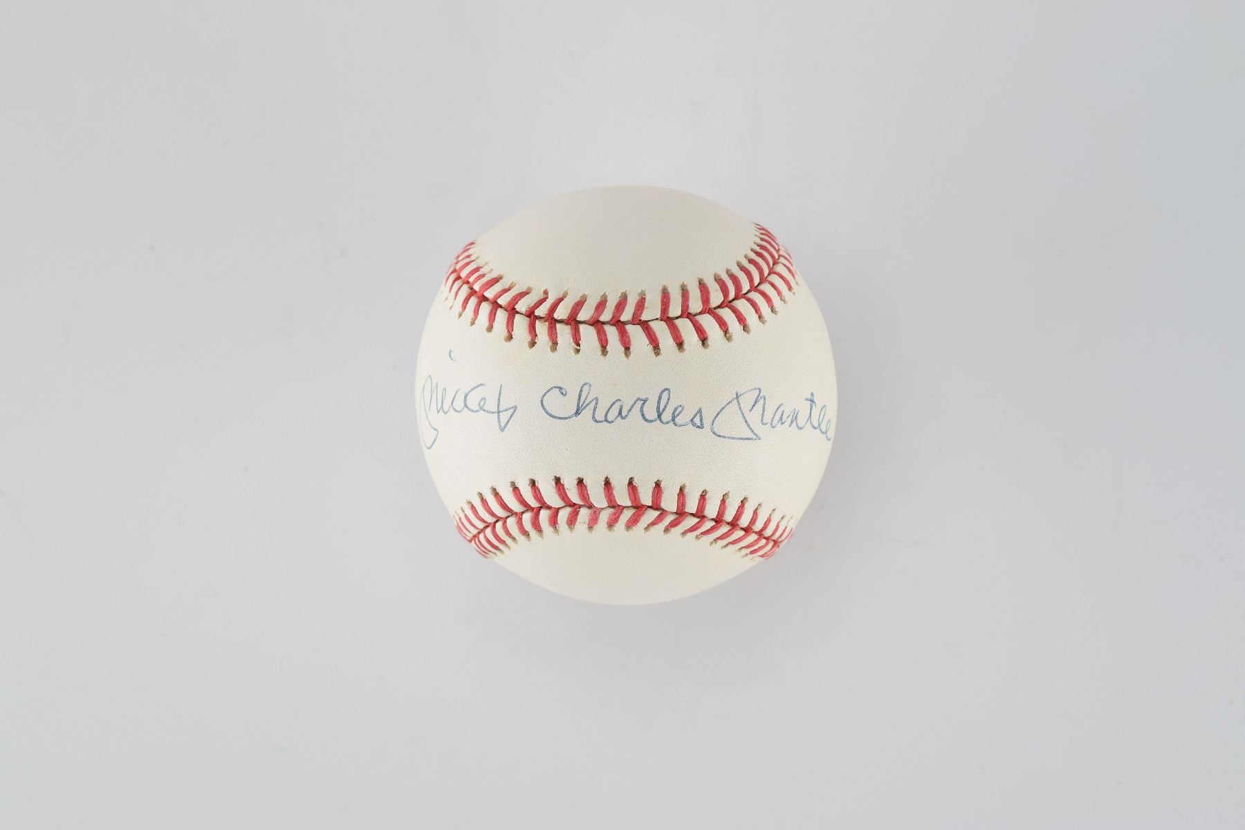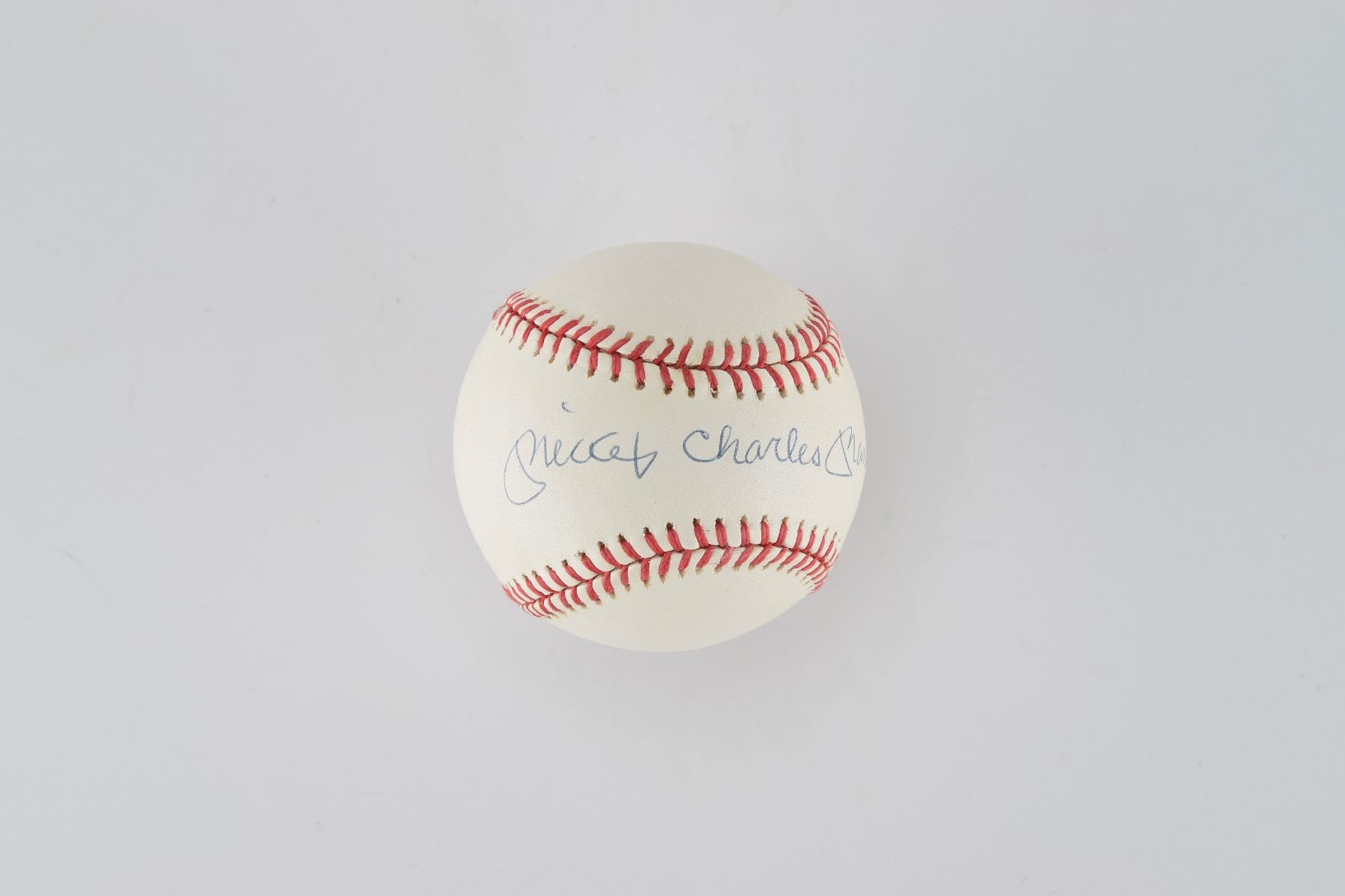 Perfectly placed blue ink "Mickey Charles Mantle" signature on a pristine white OAL Brown baseball.