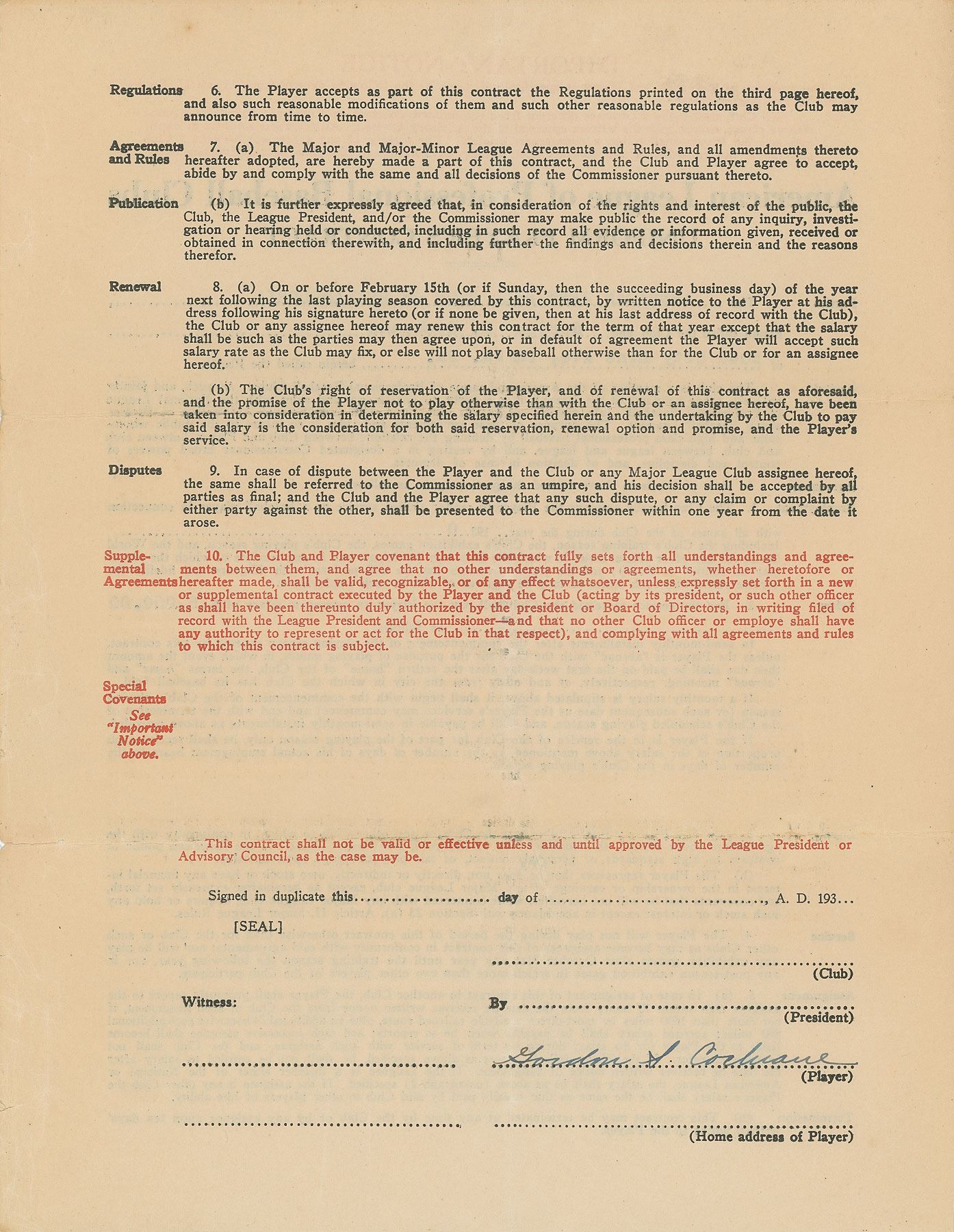 Contract, signed “Gordon S. Cochrane,” four pages on two adjoining sheets, 8.5 x 11, [1930]. American League uniform player’s contract in which Mickey Cochrane agrees to render "skilled service as a baseball player in connection with all games of the Club during the year 1930” for the Philadelphia Athletics, for a salary of $16,000. Signed at the conclusion in fountain pen by Cochrane. In very good to fine condition, with slight creasing and a vertical fold, and small edge tears and partial separations to folds. Cochrane was the premier catcher in the league by 1930, guiding his A's pitching staff to their second consecutive World Championship that season.