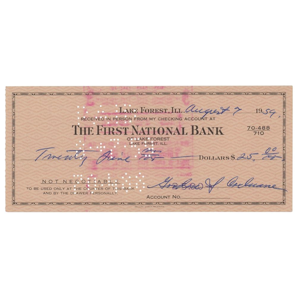 First National Bank non-negotiable check, 6.25 x 2.75, filled out and signed by Cochrane, "Gordon S. Cochrane," for $25 received, August 7, 1959. In fine condition.
