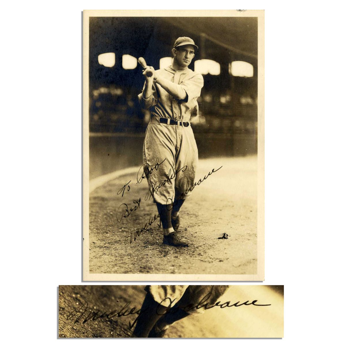 Signed photo of baseball Hall of Famer Mickey Cochrane, who batted .320 during his 13-year career. Signed and inscribed in black ink, ''To Bob / Best Wishes / Mickey Cochrane''. Matte photo measures 4'' x 6''. Some soiling and scuffing; overall in very good condition.