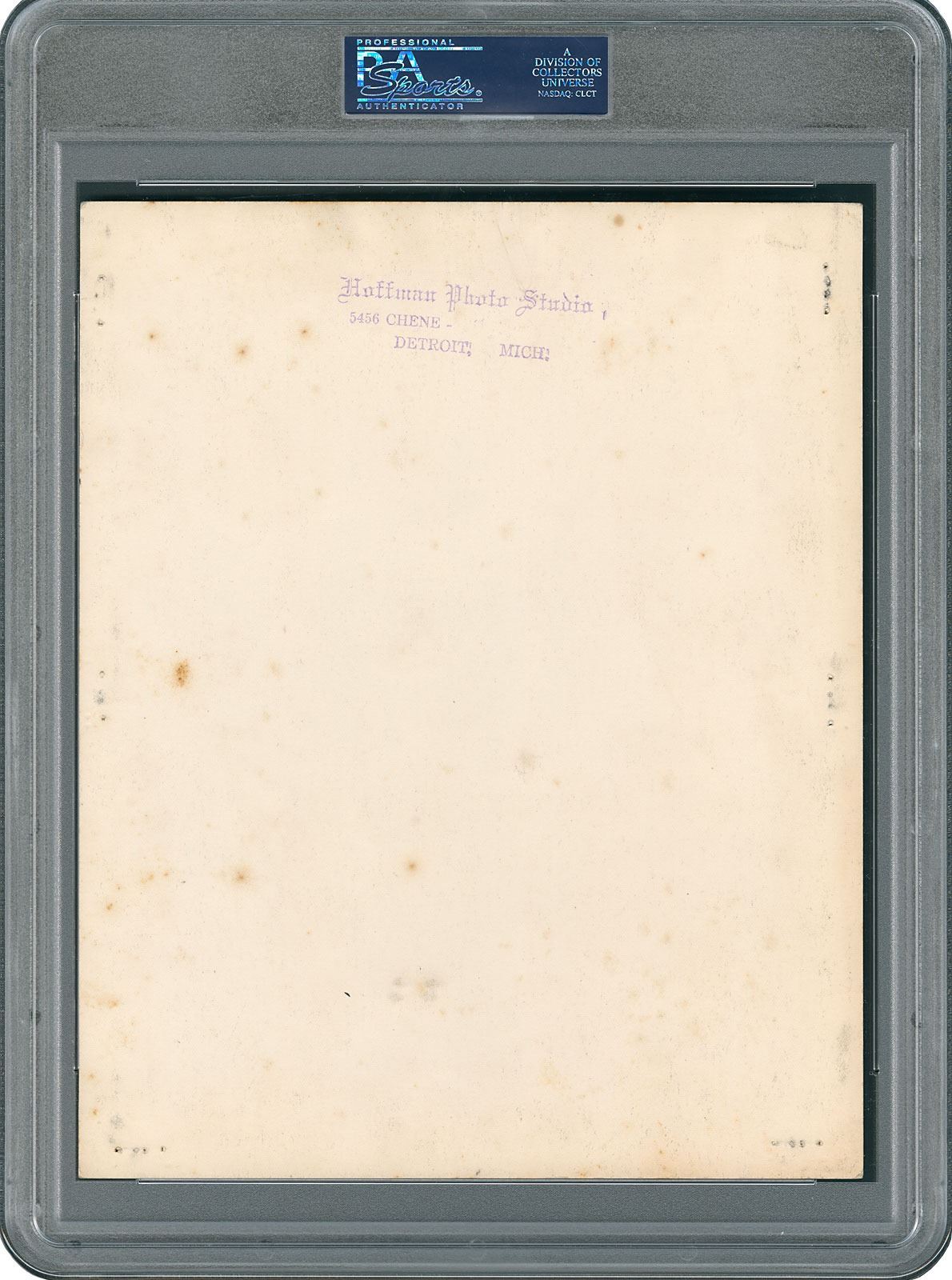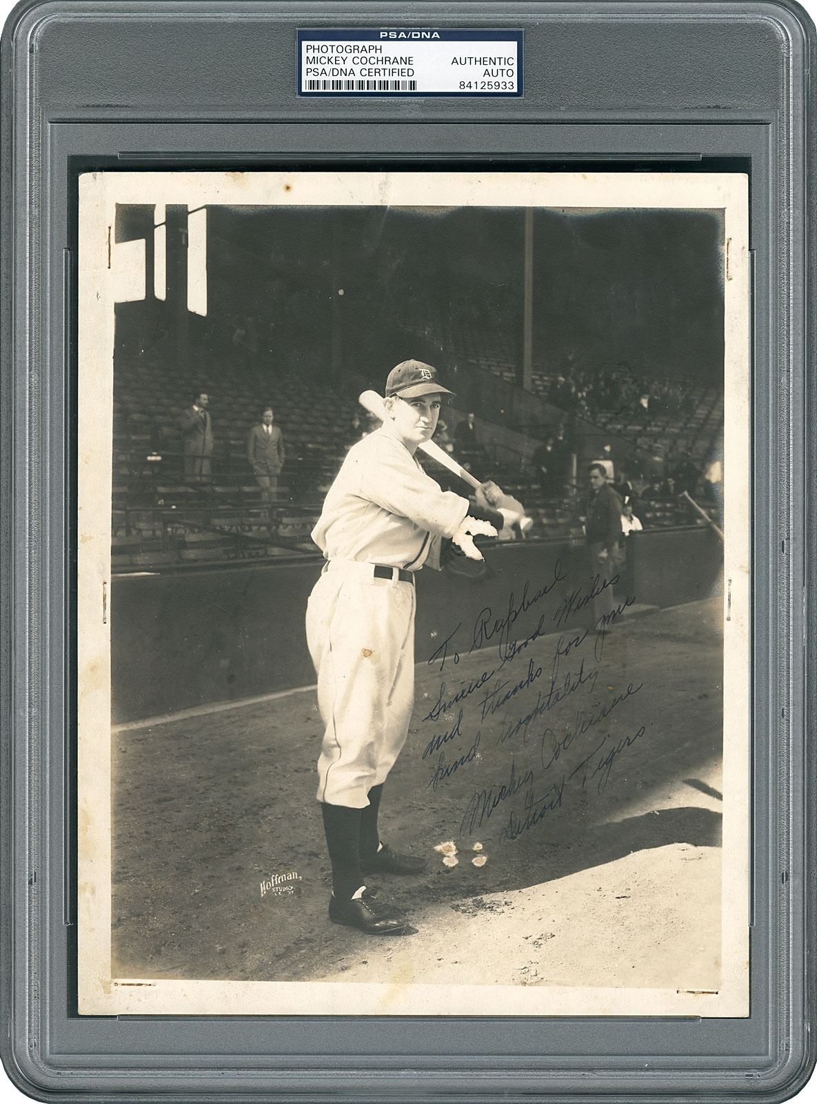 Classic matte-finish 8 x 10 photo of the Hall of Fame catcher in his batting stance, signed and inscribed in fountain pen, "To Raphael, Sincere good wishes and thanks for your kind hospitality, Mickey Cochrane, Detroit Tigers.” Reverse bears the credit stamp of Hoffman Photo Studio in Detroit. In very good condition, with four spots of surface loss below the signature, some minor staining to borders, and rust marks to the perimeter. Encapsulated in a PSA/DNA authentication holder.