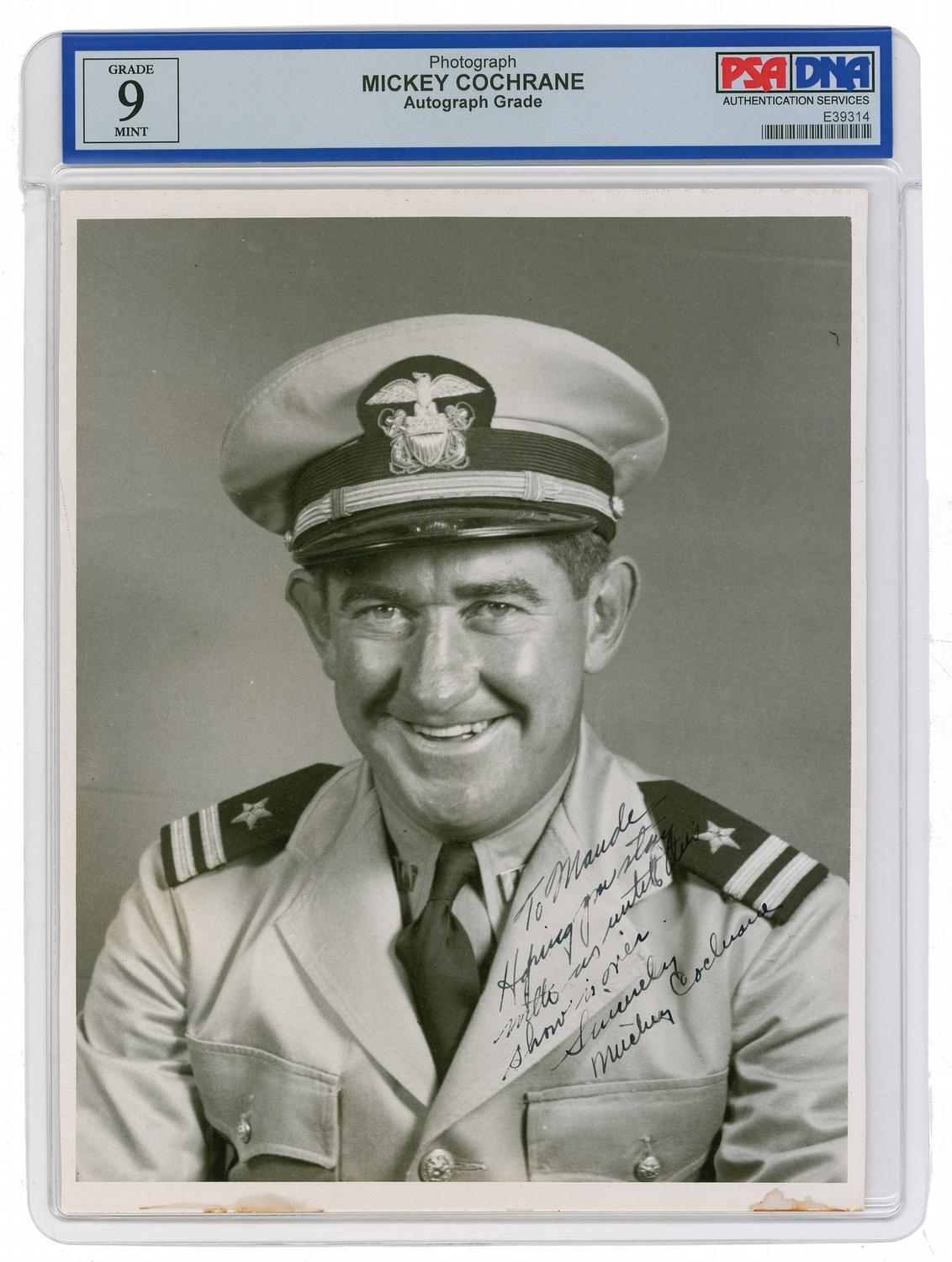 Baseball Hall of Famer (1903–1962) who batted .320 during his 13-year career. Vintage glossy 8 x 10 photo of Cochrane as a US Navy lieutenant, signed and inscribed in fountain pen “To Maude, Hope you stay up until this show is over. Sincerely, Mickey Cochrane.” Encapsulated in a plastic PSA/DNA authentication holder, grading the autograph MINT 9. In fine condition, with two small areas of soiling along the bottom edge. A unique portrait of the legendary catcher who left baseball to serve his country during World War II.