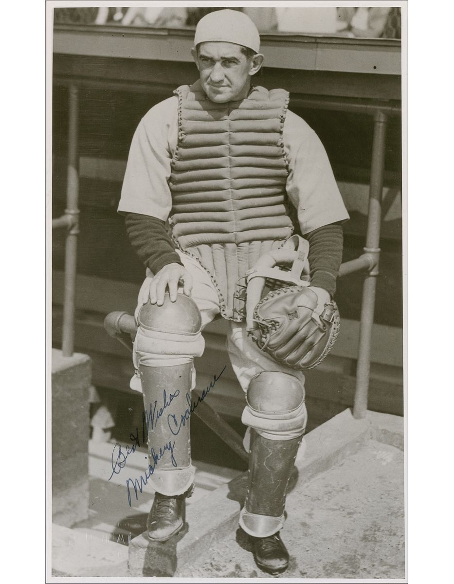 Baseball Hall of Famer (1903–1962) who batted .320 during his 13-year career. Vintage glossy 6 x 9.5 Milwaukee Journal press photo of Cochrane posing outside the dugout in his catcher’s gear, signed in fountain pen, “Best Wishes, Mickey Cochrane.” In fine condition, with a few scattered light surface marks and an embossed photographer’s stamp to lower left. Cochrane is quite uncommon in photos of this size.