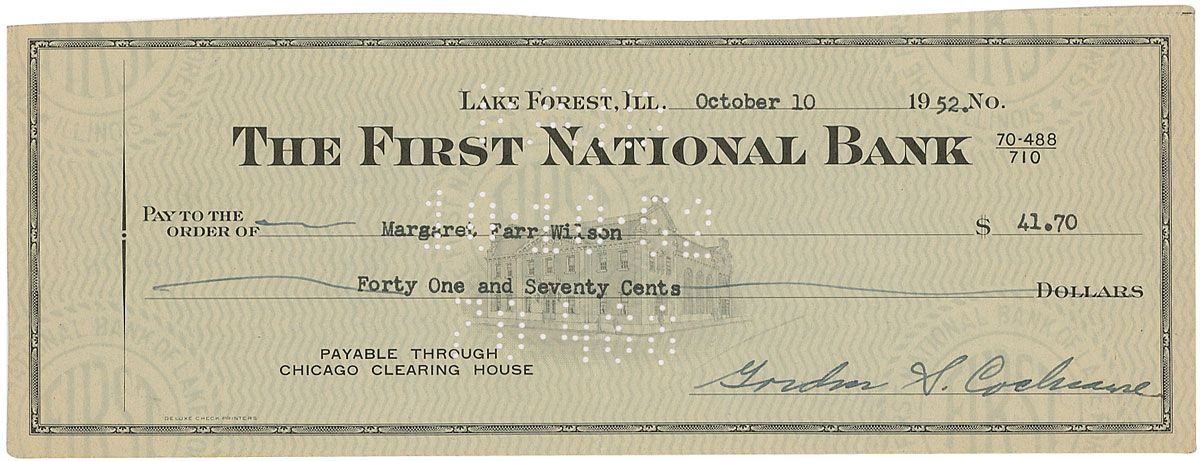 Bank check, 8.25 x 3, filled out in type and signed by Cochrane, “Gordon S. Cochrane,” payable to Margaret Farr Wilson for $41.70, October 10, 1952. In fine condition, with several vertical folds, one through a single letter of signature, cancellation holes to center, and a trimmed top edge.
