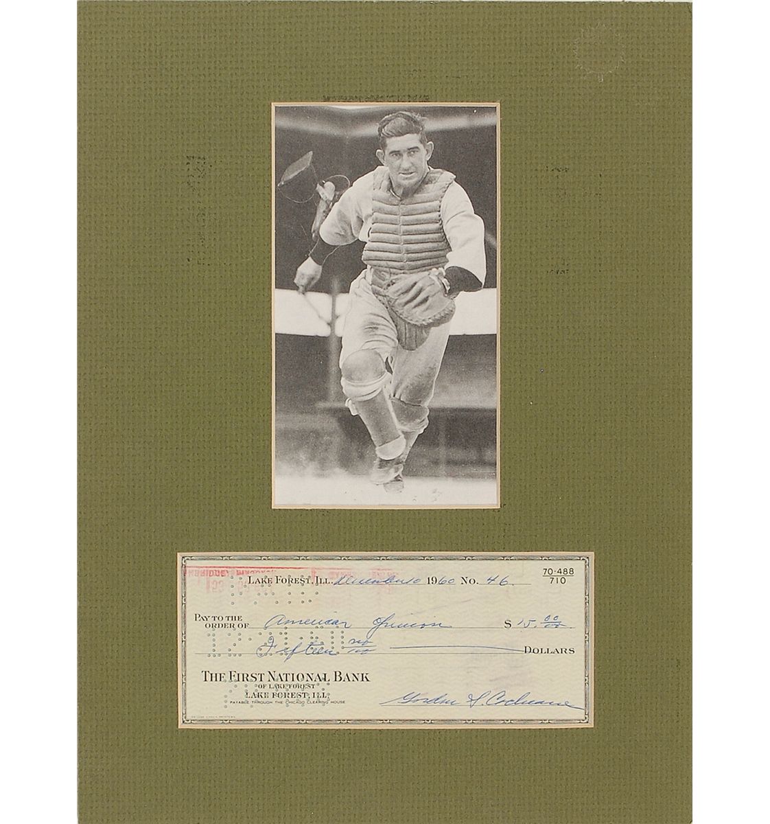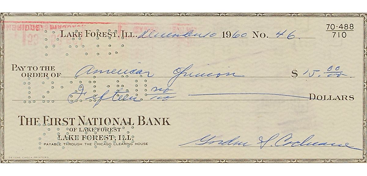 Check, 6 x 2.5, filled out and signed by Cochrane, “Gordon S. Cochrane,” payable to American Opinion for $15.00, December 10, 1960. Matted with a photo of Cochrane in his gear to an overall size of 9 x 12. In fine condition, with cancellation holes to body and show-through from stamps on reverse.