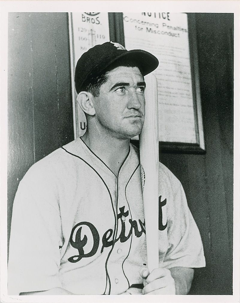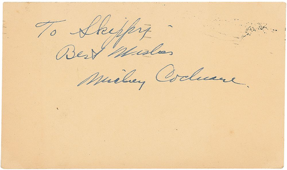 Vintage fountain pen signature and inscription, “To Skippy, Best wishes, Mickey Cochrane,” on an off-white 5.5 x 3.25 government postcard (postmarked 9/5/1949). In fine condition, with a light cancellation stamp affecting part of the inscription. Accompanied by an unsigned glossy 8 x 10 photo of Cochrane in his Tiger’s uniform.