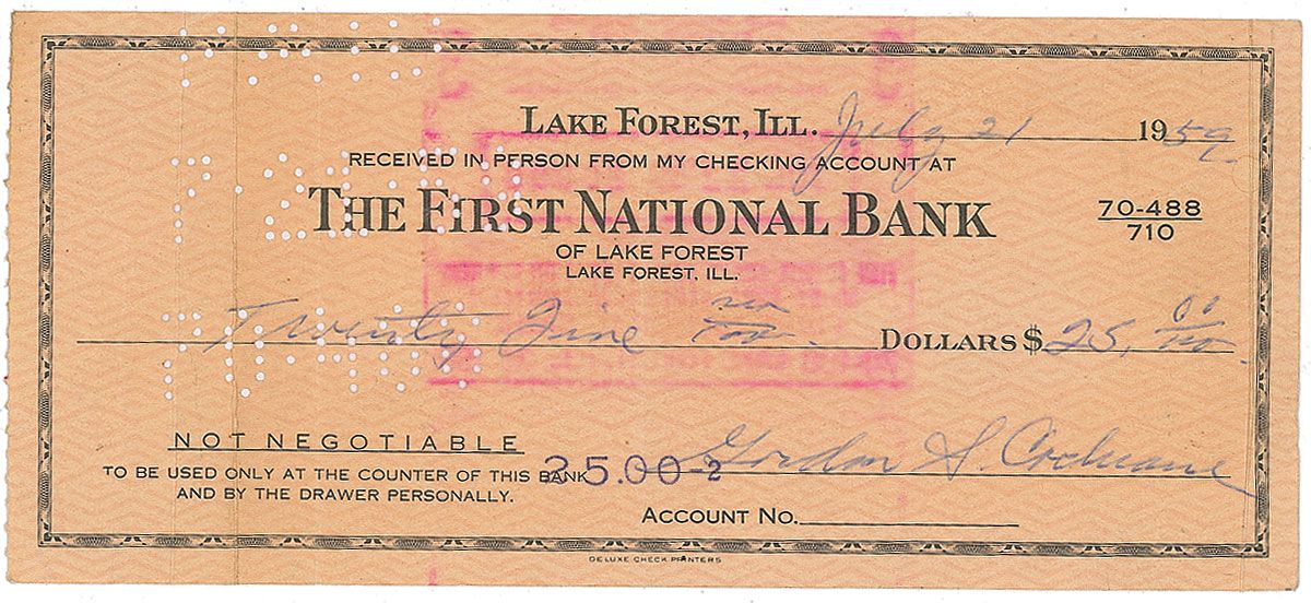 Bank check, 6.25 x 2.75, filled out and signed by Cochrane, “Gordon S. Cochrane,” for $25.00, July 21, 1959. In very good condition, with several vertical folds, and expected stamps and holes.